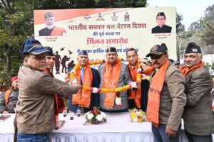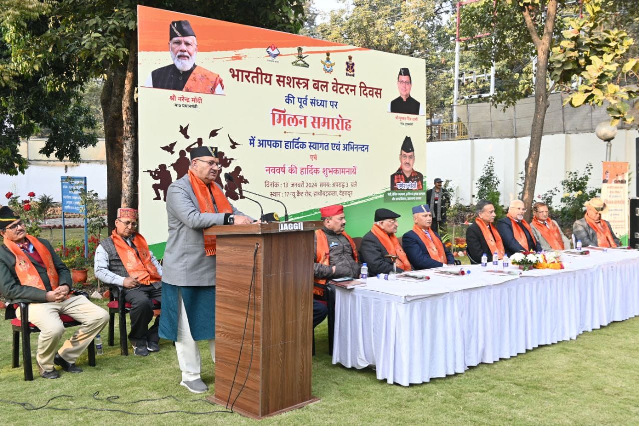 देहरादून, 13 जनवरी। सैनिक कल्याण मंत्री गणेश जोशी द्वारा भारतीय सहस्त्र बल वेटरन दिवस की पूर्व संध्या पर मिलन समारोह कार्यक्रम आयोजित किया गया। इस अवसर पर सैनिक कल्याण मंत्री गणेश जोशी ने वैटनर्स डे में वीरता पदक धारकों तथा वयोवृद्ध सैनिकों को श्रीराम का पटका पहनाकर सम्मानित किया तथा नए वर्ष की डायरी भेंट क