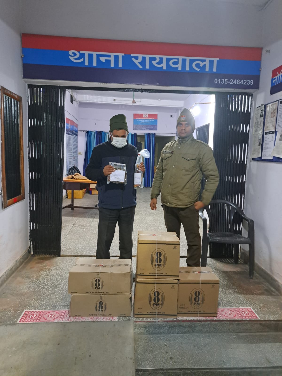दिनाँक 01-02-24 की रात्रि में रायवाला पुलिस द्वारा दौराने चेकिंग मुखबिर की सूचना पर गौहरी माफी रायवाला स्थित एक मकान के पीछे खेत मे से 01 अभियुक्त विरेन्द्र रतूडी पुत्र स्व0 श्री रामदयाल रतूडी को 05 पेटी अवैध अग्रेजी शराब के साथ गिरफ्तार किया गया। गिरफ्तार अभियुक्त के विरुद्ध थाना रायवाला पर मु0अ0स0-18/24 धारा 60(1) आबकारी एक्ट के तहत अभियोग पंजीकृत किया गया।