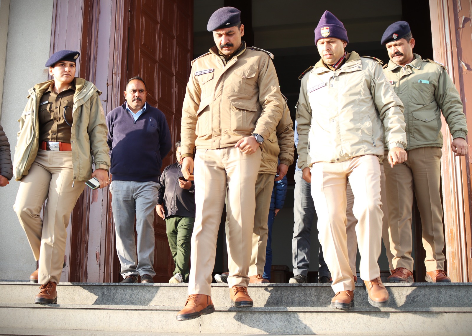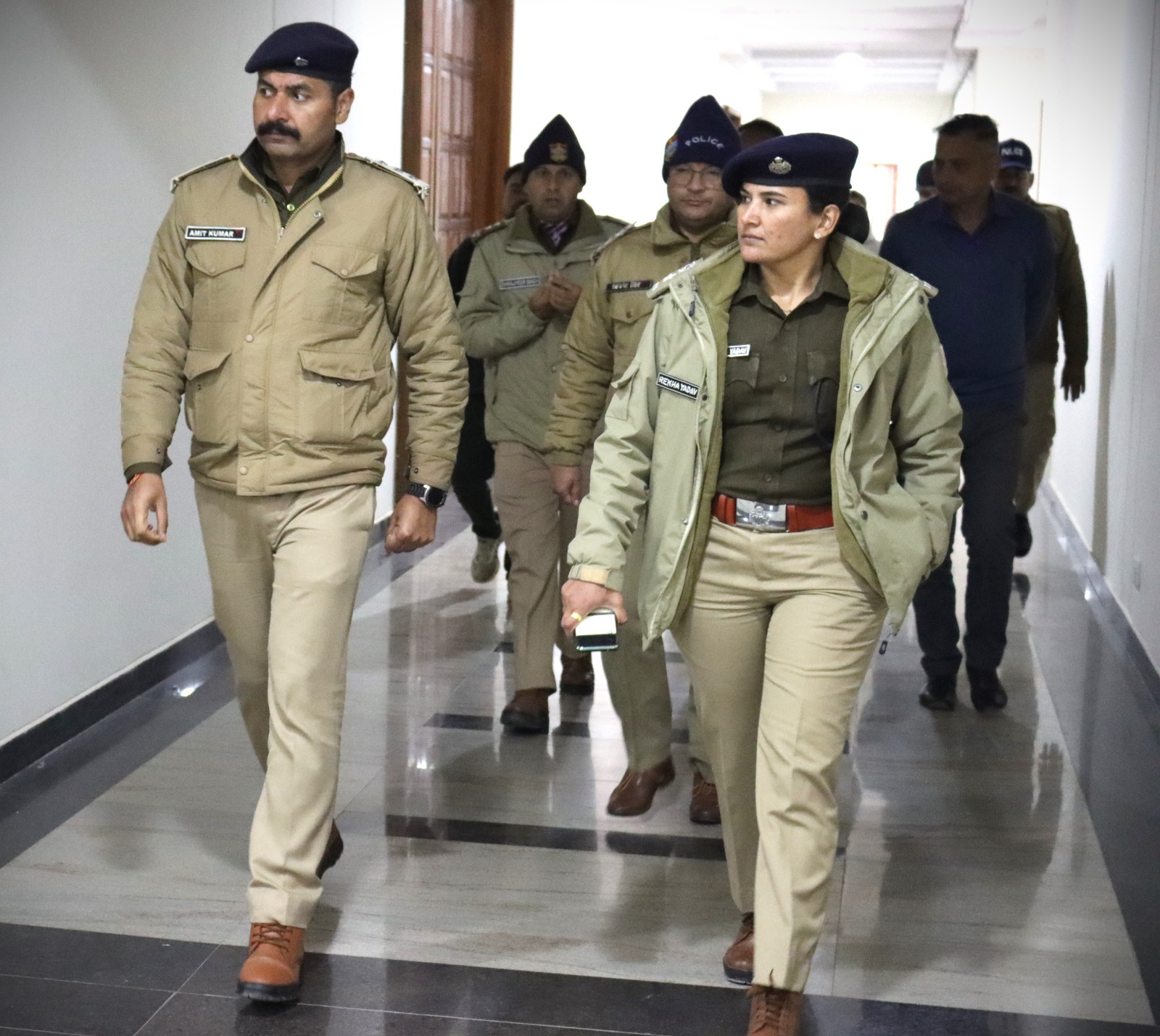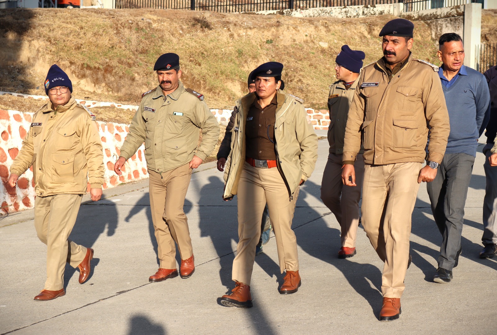 विधानसभा भराडीसैण में सम्भावित विधानसभा बजट सत्र की तैयारियों के दृष्टिगत पुलिस अधीक्षक चमोली श्रीमती रेखा यादव (IPS) महोदया द्वारा दिनाँक 06 फरवरी 2024 को पुलिस अधिकारियों के साथ सम्पूर्ण भराड़ीसैंण क्षेत्र पुलिस लाइन भराड़ीसैंण, हेलीपैड, विधानसभा भवन का भ्रमण कर पर्याप्त सुरक्षा व्यवस्था एवं मूलभूत आवश्यकताओं, पुलिस कर्मियों हेतु भोजनालय, आवासीय बैरिक, बिजली, पानी, शौचालयों आदि का निरीक्षण कर तैयारियों को पूर्ण करने हेतु आवश्यक दिशा निर्देश दिए गए-
