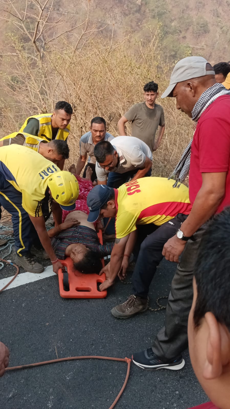 जिसके क्रम में आज दिनांक 16.06.2024 को प्रातः समय लगभग 6:00 बजे डीसीआर के माध्यम से थाना लैन्सडाउन पर सूचना प्राप्त हुई कि गुमखाल और सतपुली के बीच कुल्हड़ मोड़ के पास एक वाहन UK15TA-0713 सूमो गोल्ड अनियंत्रित होकर गहरी 100 मीटर खाई में गिर गयी है। इस सूचना पर तत्काल प्रभारी चौकी गुमखाल एवं सतपुली से एसडीआरएफ मय आपदा उपकरणों सहित तत्काल मौके पर पहुँचे तथा कड़ी मशकत करते हुये घायलों का रेस्क्यूकर घायलों को 108 एम्बूलेन्स के माध्यम से उपचार हेतू हंस हॉस्पिटल सतपुली भेजा गया। जानकारी करने पर पता चला कि उक्त वाहन में 09 व्यक्ति सवार थे जो तिमली गांव से हरिद्वार स्नान करने जा रहे थे।