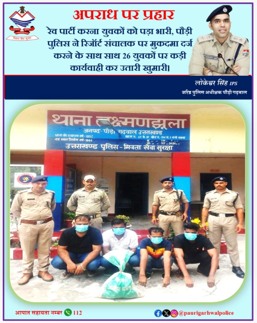 लक्ष्मणझूला के मोहनचट्टी में पॉम व्यू रिजॉर्ट में रेव पार्टी करना युवकों को पड़ा भारी, पौड़ी पुलिस ने रिजॉर्ट संचालक पर मुकदमा दर्ज करने के साथ साथ 26 युवकों पर कड़ी कार्यवाही कर उतारी खुमारी।
