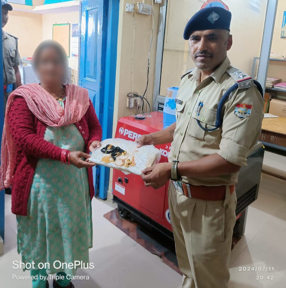 ग्राम जेठी गांव निवासी महिला श्रीमती भागीरथी देवी ने कोतवाली अस्कोट में सूचना दी कि उनका 5 तोला सोने के आभूषण (मंगलसूत्र, एक जोड़ी कान के कुंडल, एक नथ, एक मांग टीका) गुम हो गये हैं, जिससे वह बहुत परेशान हैं । सूचना मिलते ही वरिष्ठ उ0नि0 कोतवाली अस्कोट हरीश सिंह के नेतृत्व में पुलिस टीम द्वारा सुरागरसी-पतारसी करते हुए कुछ ही घण्टों के अन्दर उक्त गुम हुए आभूषण बरामद कर उक्त महिला के सुपुर्द किया गया । महिला द्वारा अपने आभूषण वापस पाकर खुशी जाहिर करते हुए पुलिस का आभार प्रकट किया । एस0पी0 रेखा यादव व सी0ओ0 परवेज अली द्वारा पुलिस टीम की सराहना की गयी ।