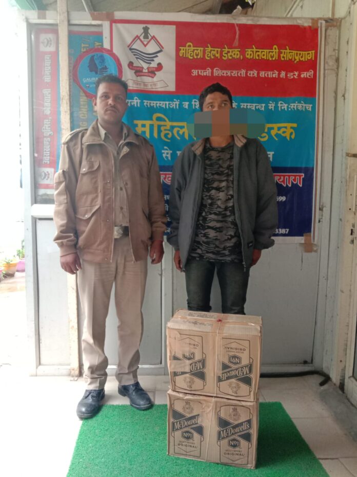 जनपद रुद्रप्रयाग में प्रचलित श्री केदारनाथ यात्रा के सफल संचालन हेतु पुलिस अधीक्षक रुद्रप्रयाग के निर्देशन में अवैध शराब व मादक पदार्थों की तस्करी को रोकने के लिए जनपद रुद्रप्रयाग पुलिस द्वारा सघन चैकिंग अभियान चलाया जा रहा है। यात्रा व्यवस्थाओं के सकुशल संचालन के साथ ही जनपद पुलिस के स्तर से प्रभावी चैकिंग व मुखबिर तन्त्र विकसित करते हुए यात्रा की आड़ में शराब की तस्करी करने वालों के विरुद्ध वैधानिक कार्यवाही की जा रही है। इसी क्रम में कोतवाली सोनप्रयाग क्षेत्रान्तर्गत चौकी भीमबली पुलिस ने चौकी क्षेत्रान्तर्गत 01 नेपाली मूल के व्यक्ति को 02 पेटी (24 बोतल) मेकडॉवल्स व्हिस्की अवैध शराब के साथ गिरफ्तार किया है, जिसके विरुद्ध कोतवाली सोनप्रयाग पर आबकारी अधिनियम की सुसंगत धाराओं में अभियोग पंजीकृत कर आवश्यक कार्यवाही की गयी है।