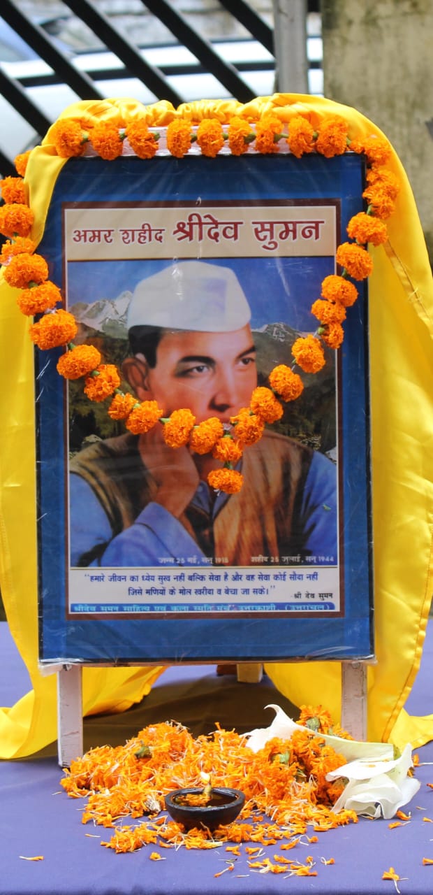 टिहरी जनक्रांति के महानायक, महान स्वतंत्रता सेनानी, देवभूमि उत्तरखण्ड के अमर शहीद श्रीदेव सुमन जी के बलिदान दिवस के अवसर पर आज 25 जुलाई 2024 को पुलिस लाईन ज्ञानसू, पुलिस कार्यालय उत्तरकाशी, यातायात कार्यालय सहित जनपद के सभी कोतवाली/थाना/चौकी/ फायर स्टेशन पर उत्तरकाशी पुलिस के अधिकारी व कर्मचारियों द्वारा श्री देव सुमन जी के चित्र पर माल्यार्पण व श्रद्धासुमन अर्पित कर श्रद्धांजलि दी गयी। इस मौके पर टिहरी रियासत के प्रति उनके आक्रोश व भारत की स्वतंत्रता मे उनके बलिदान का पुनर्स्मरण किया गया।