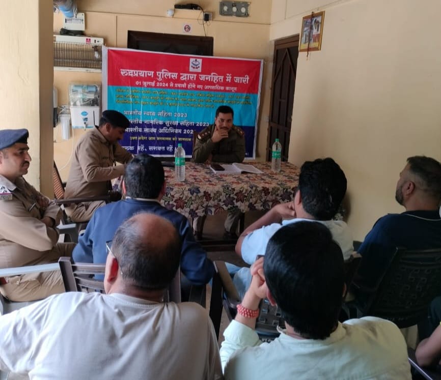 पुलिस अधीक्षक रुद्रप्रयाग द्वारा देश में लागू हुए तीन नए कानूनों (1) भारतीय न्याय संहिता 2023, (2) भारतीय नागरिक सुरक्षा संहिता 2023, (3) भारतीय साक्ष्य अधिनियम 2023 के लागू होने के पश्चात अधिक से अधिक आमजनमानस को जागरुक किए जाने हेतु सभी अधीनस्थों को निर्देश निर्गत किये गये है। इसी के क्रम में प्रभारी निरीक्षक कोतवाली सोनप्रयाग देवेन्द्र असवाल ने चौकी प्रभारी गौरीकुण्ड कुलेन्द्र सिंह रावत की उपस्थिति में चौकी गौरीकुण्ड में स्थानीय व्यक्तियों, व्यापारियों, गणमान्य व्यक्तियों एवं घोड़ा खच्चर संचालकों सहित बाहरी/ नेपाली मूल के दुकानदारों/मजदूरों आदि के साथ गोष्ठी आयोजित की गयी। जिसमें दिनांक 01 जुलाई 2024 से समस्त भारतवर्ष में प्रभावी नये कानूनों के बारे में जागरुक करते हुये अवगत कराया कि नये कानून एक महत्वपूर्ण बदलाव का प्रतीक है, जो सामाजिक गतिशीलता को प्रदर्शित करता है।