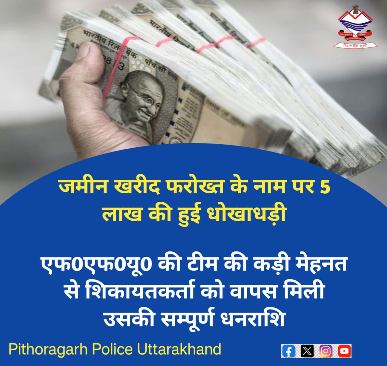 जिस क्रम में गोविन्द सिंह खोलिया द्वारा पिथौरागढ़ पुलिस को एक शिकायती प्रार्थना पत्र दिया कि एक व्यक्ति ने उनसे जमीन दिलाने के नाम पर 5 लाख रूपये ले लिये । अब वह न तो जमीन दे रहा है और न ही पैसे वापस कर रहा है । जनपद की फाइनेन्सियल फॉड यूनिट द्वारा जाँच पड़ताल की तथा आवश्यक दस्तावेज चैक करते हुए वैधानिक कार्यवाही की गयी तथा शिकायतकर्ता की सम्पूर्ण धनराशि उसके खाते में वापस लौटाई गयी । शिकायतकर्ता द्वारा पुलिस का आभार व्यक्त किया ।