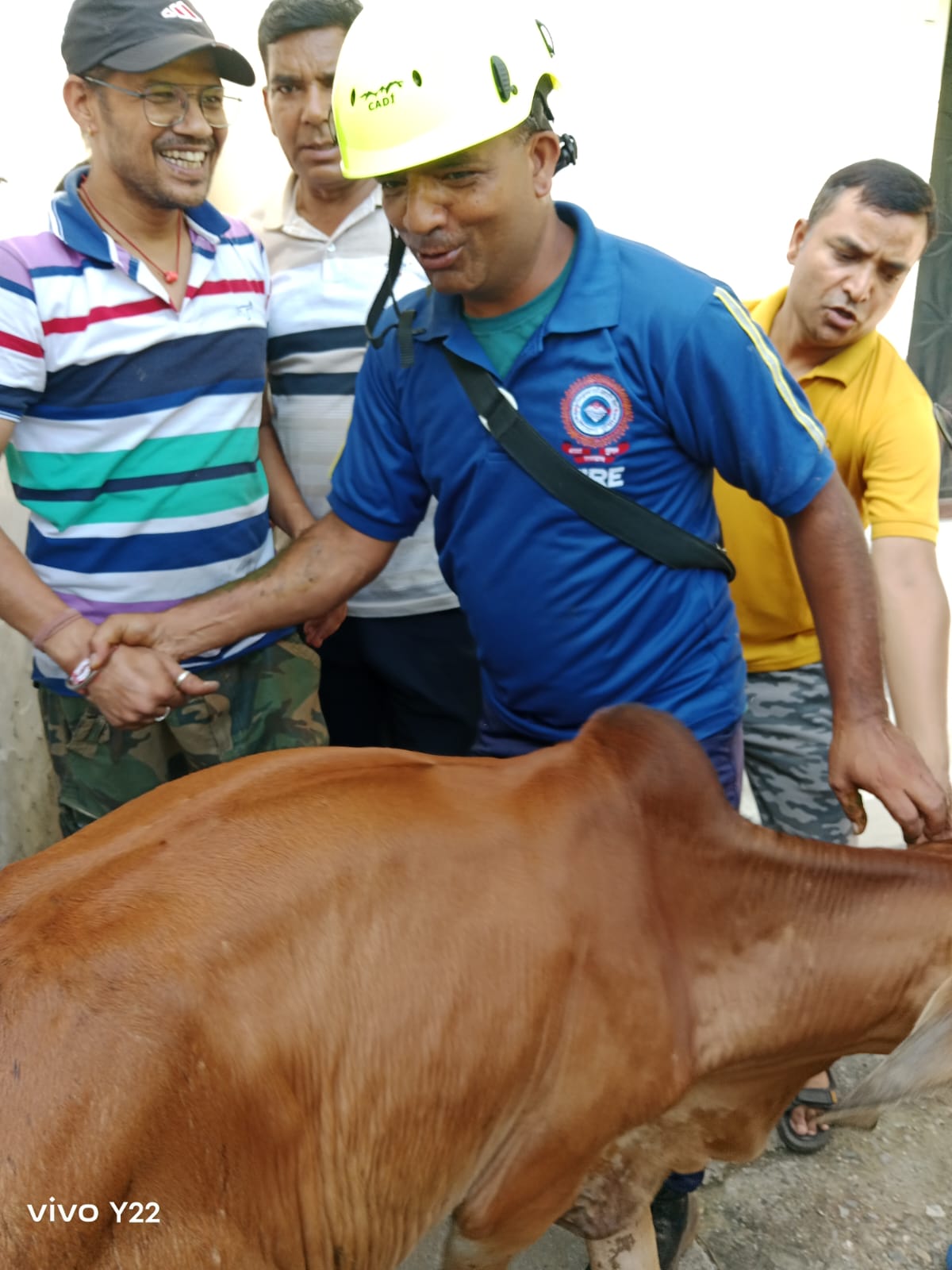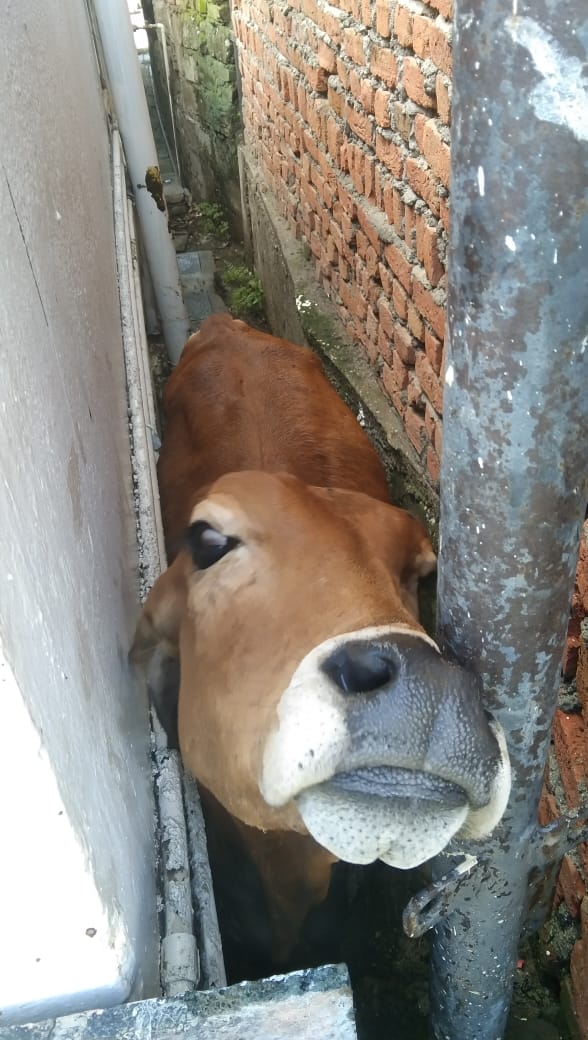 फायर टीम द्वारा त्वरित कार्यवाही कर दीवारों के बीच में फंसी गाय को सुरक्षित बाहर निकाला।