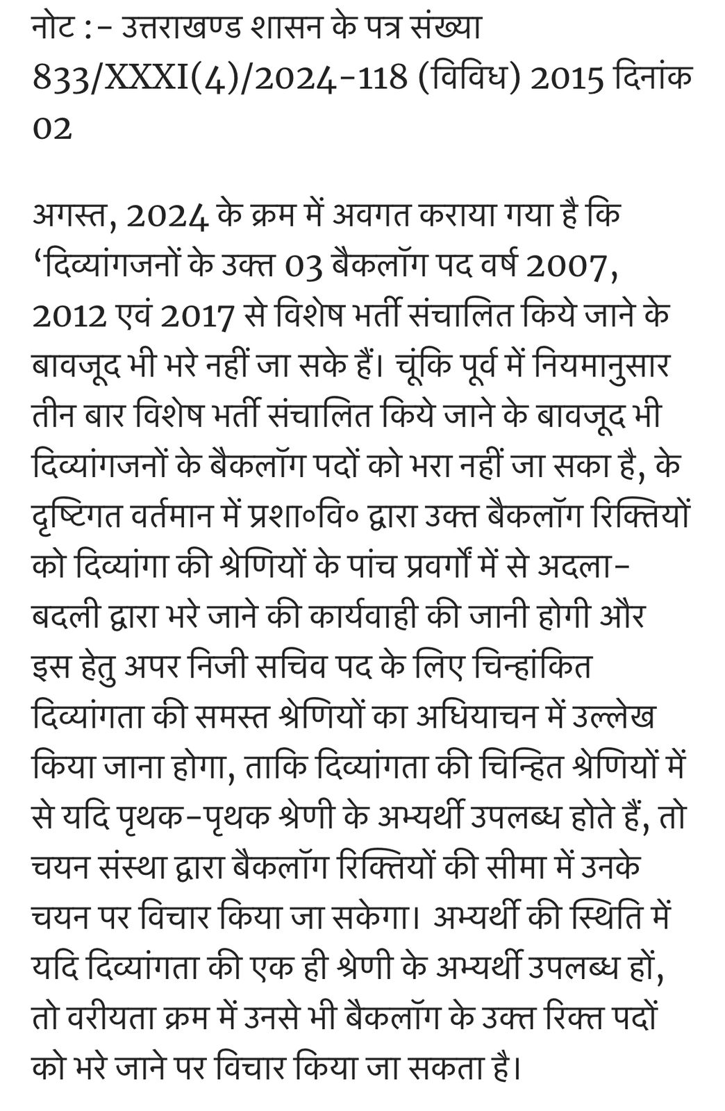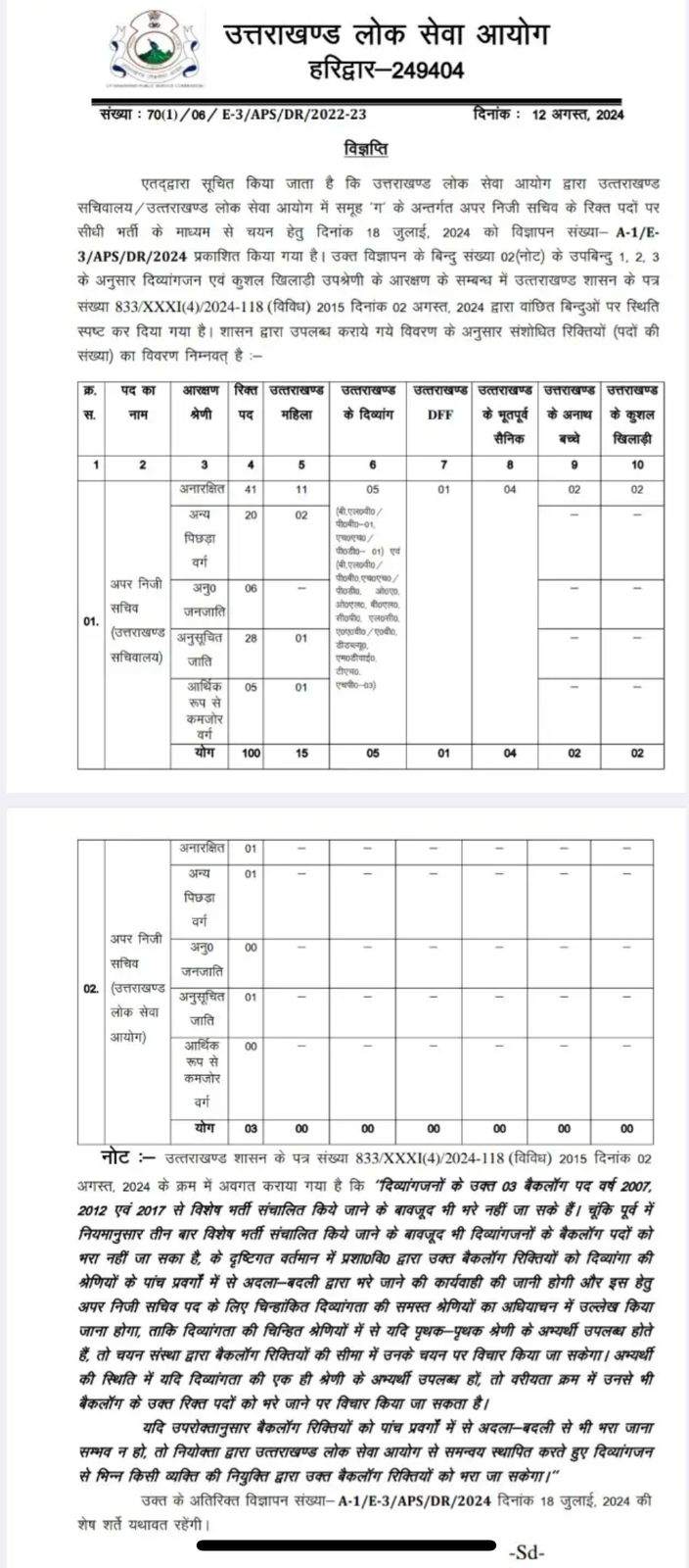 उत्तराखण्ड लोक सेवा आयोग द्वारा उत्तराखण्ड सचिवालय / उत्तराखण्ड लोक सेवा आयोग में समूह ‘ग’ के अन्तर्गत अपर निजी सचिव के रिक्त पदों पर सीधी भर्ती के माध्यम से चयन हेतु दिनांक 18 जुलाई, 2024 को विज्ञापन संख्या- A-1/E- 3/APS/DR/2024 प्रकाशित किया गया है। उक्त विज्ञापन के बिन्दु संख्या 02 (नोट) के उपबिन्दु 1, 2, 3 के अनुसार दिव्यांगजन एवं कुशल खिलाड़ी उपश्रेणी के आरक्षण के सम्बन्ध में उत्तराखण्ड शासन के पत्र संख्या 833/XXXI(4)/2024-118 (विविध) 2015 दिनांक 02 अगस्त, 2024 द्वारा वांछित बिन्दुओं पर स्थिति स्पष्ट कर दिया गया है। शासन द्वारा उपलब्ध कराये गये विवरण के अनुसार संशोधित रिक्तियों (पदों की संख्या) का विवरण निम्नवत् है :-