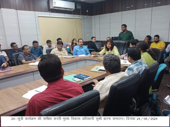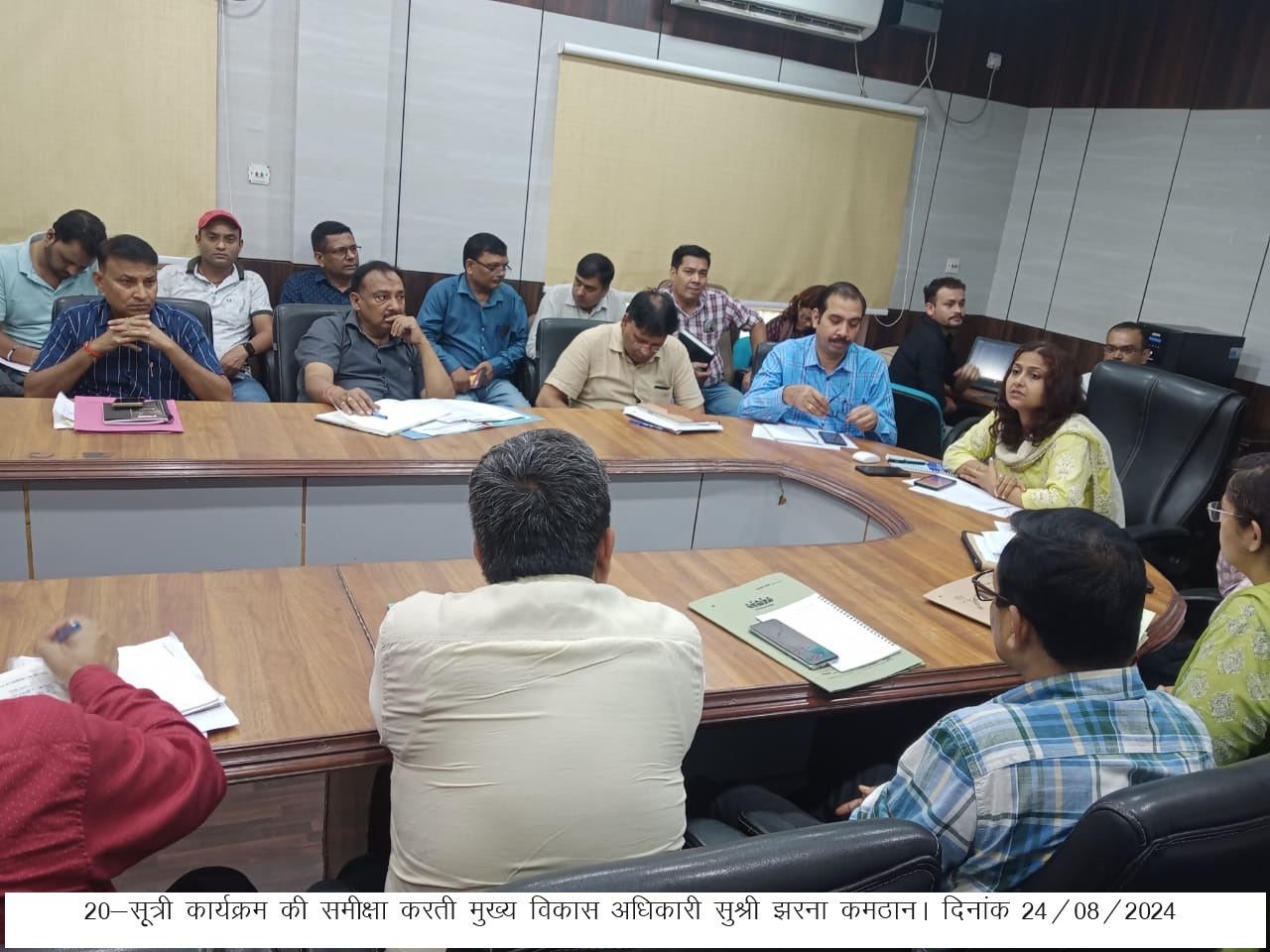 मुख्य विकास अधिकारी ने 20 सूत्रीय कार्यक्रम की माह जुलाई 2024 तक की समीक्षा की, समीक्षा के दौरान 30 मदें ए श्रेणी में रही तथा 5 मदें बी श्रेणी, 3 मदें सी श्रेणी तथा 07 मदे डी श्रेणी में रही। डी श्रेणी वाली मदों में पीएमजीएसवाई एवं राजकीय सिंचाई की प्रगति न्यून होने के फलस्वरूप स्पष्टीकरण तलब किया गया। इसी प्रकार प्रगति का सत्यापन न किये जाने पर सम्बन्धित अधिकारियों का भी स्पष्टीकरण तलब किया गया। समीक्षा बैठक उपरान्त शोध अधिकारी बीस सूत्रीय कार्यक्रम जे.सी चंदोला द्वारा उपस्थित अधिकारियों, कर्मचारियों को नव निर्मित वेबसाईट का प्रशिक्षण भी दिया गया। उन्होंने निर्देशित किया जो जिन विभागों की मदे बी,सी, एवं डी श्रेणी में है वे अपनी स्थिति में सुधार करते हुए ए श्रेणी में आने हेतु कार्य करें।