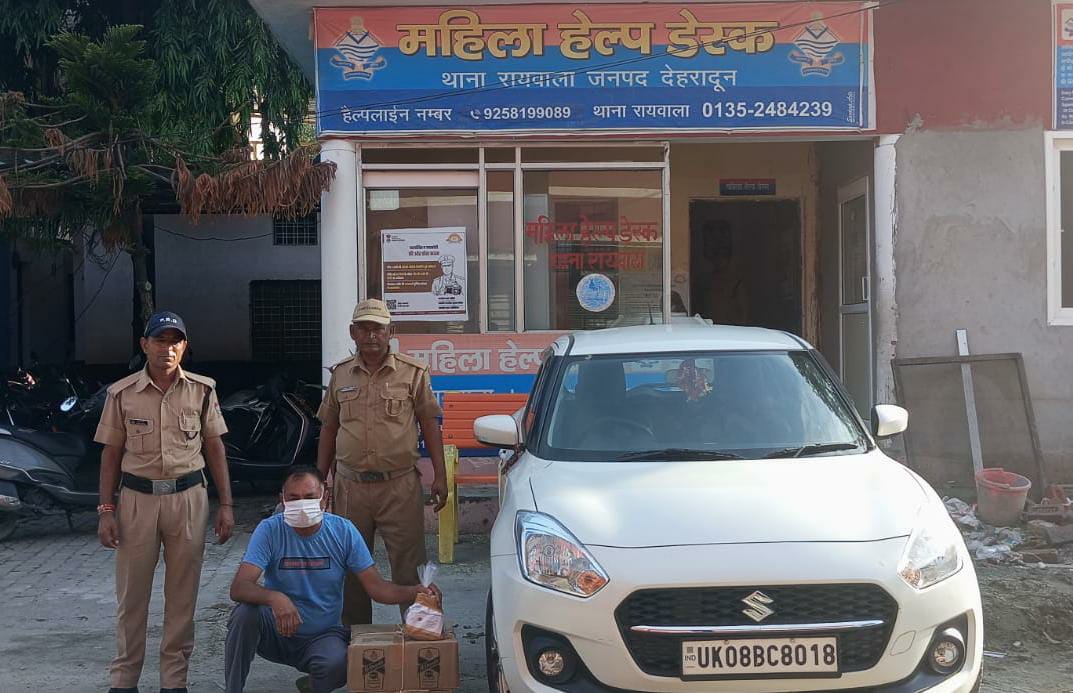 दिनांक 24 अगस्त 2024 को थाना रायवाला पुलिस द्वारा चैकिंग के दौरान एक अभियुक्त भीष्म सिंह पुत्र फुल सिंह को गौहरीमाफी रायवाला क्षेत्र में 02 पेटी (96 पव्वे ) अंग्रेजी शराब के साथ गिरफ्तार किया गया तथा शराब की तस्करी में प्रयुक्त वाहन स0 यू0के0-08- बीसी-8018 स्विफ्ट कार को सीज किया गया। अभियुक्त के विरुद्ध थाना रायवाला पर मु0अ0स0 178 /2024 धारा 60/72 आबकारी अधि0 के तहत पंजीकृत किया गया।