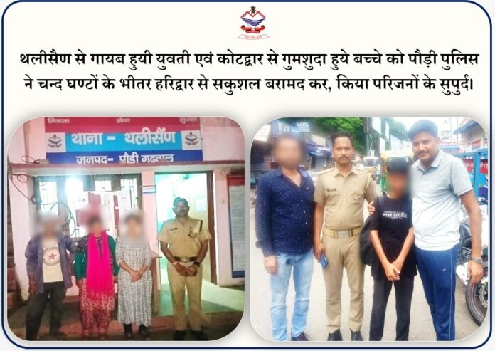 थलीसैण से गायब हुयी युवती एवं कोटद्वार से गुमशुदा हुये बच्चे को पौड़ी पुलिस ने चन्द घण्टों के भीतर हरिद्वार से सकुशल बरामद कर, किया परिजनों के सुपुर्द।