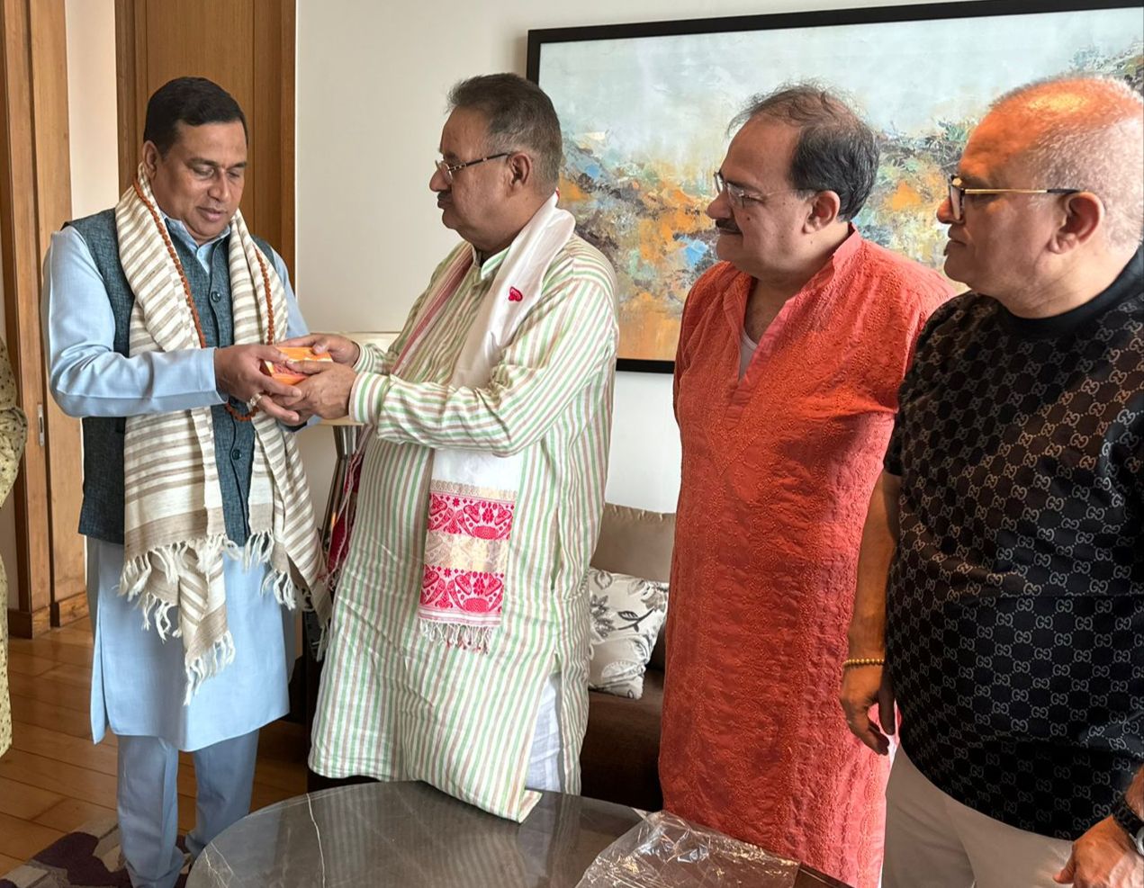 असम के पर्यटन मंत्री जयंत मल्ला बारूह से को उत्तराखण्ड के रेशम से बनी शॉल और प्रसाद भेंट करते कृषि मंत्री गणेश जोशी।