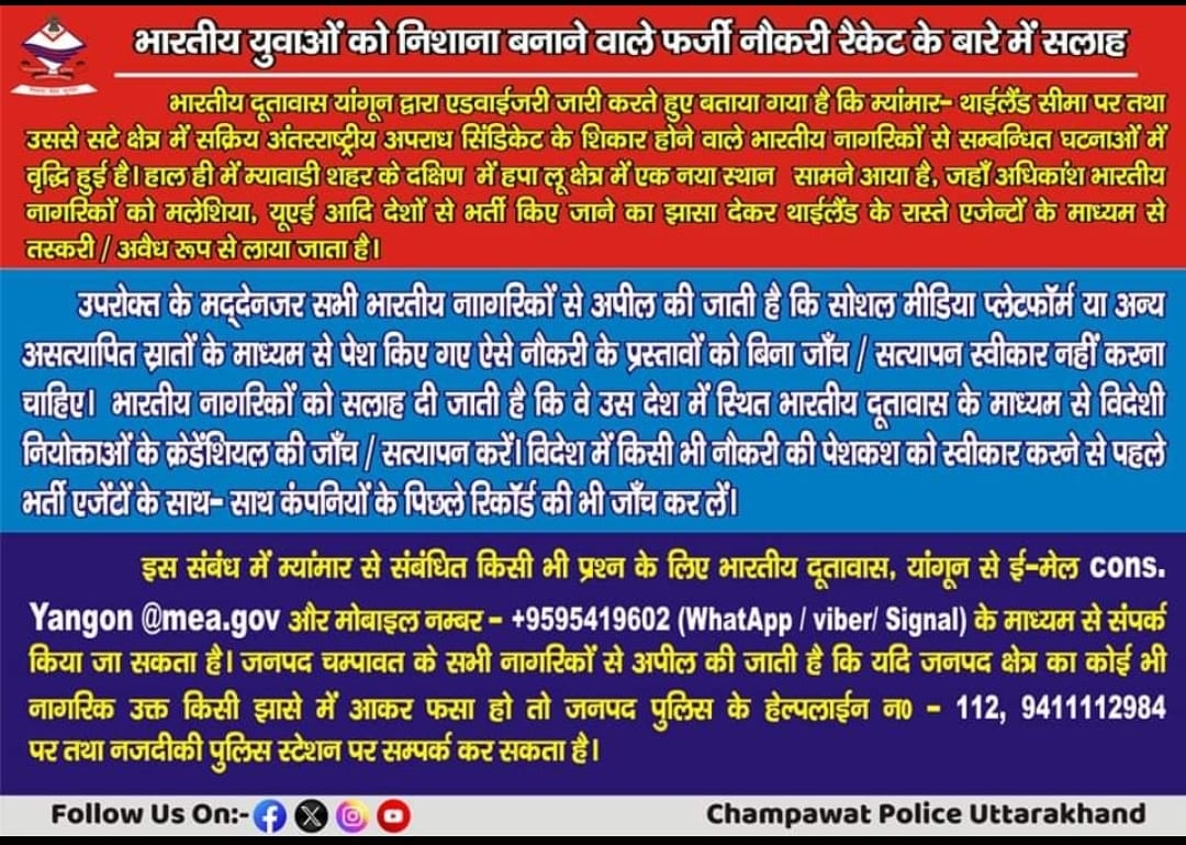 दिनांक 10.07.2024 को श्री राजेन्द्र सिह सौन पुत्र राम सिह, निवासी ग्राम गुदमी भैसाझाला बनबसा चम्पावत द्वारा लिखित तहरीर के आधार पर अवगत कराया कि मेरा पुत्र ललित सोन अपने दोस्तों विकास, कमलेश व 03 खटीमा के युवकों के साथ घर से रोजगार की तलाश में दिल्ली के लिए निकला था जहां से ये लोग बैंकाक निकल गये । जिनसे अब कोई सम्पर्क हो पा रहा है और न ही इनका कुछ पता चल पा रहा है। जिस सम्बन्ध में थाना बनबसा मे मु0 FIR NO 76/2024 धारा अन्तर्गत धारा 365 भादवि पंजीकृत किया गया।