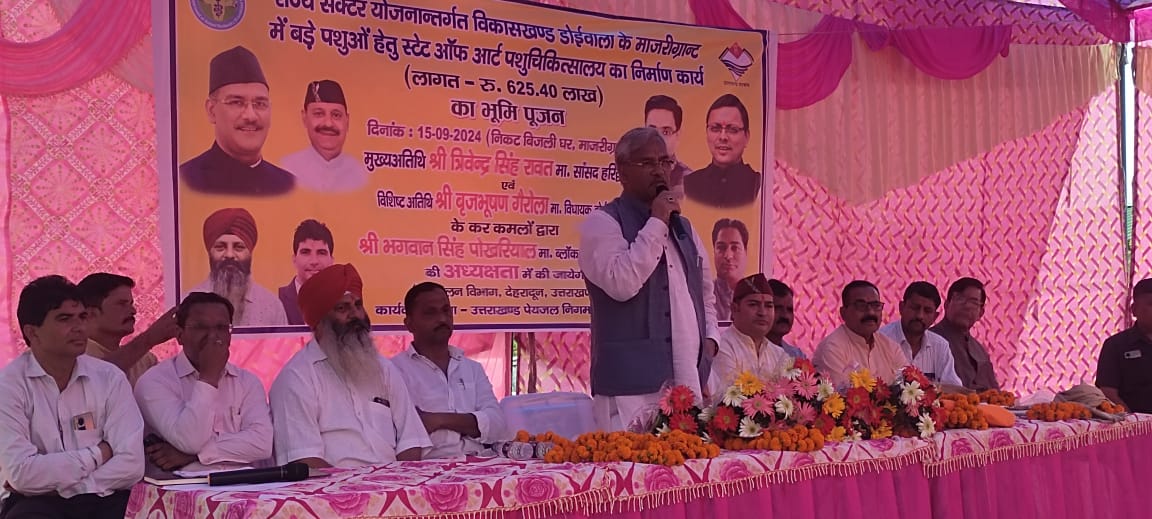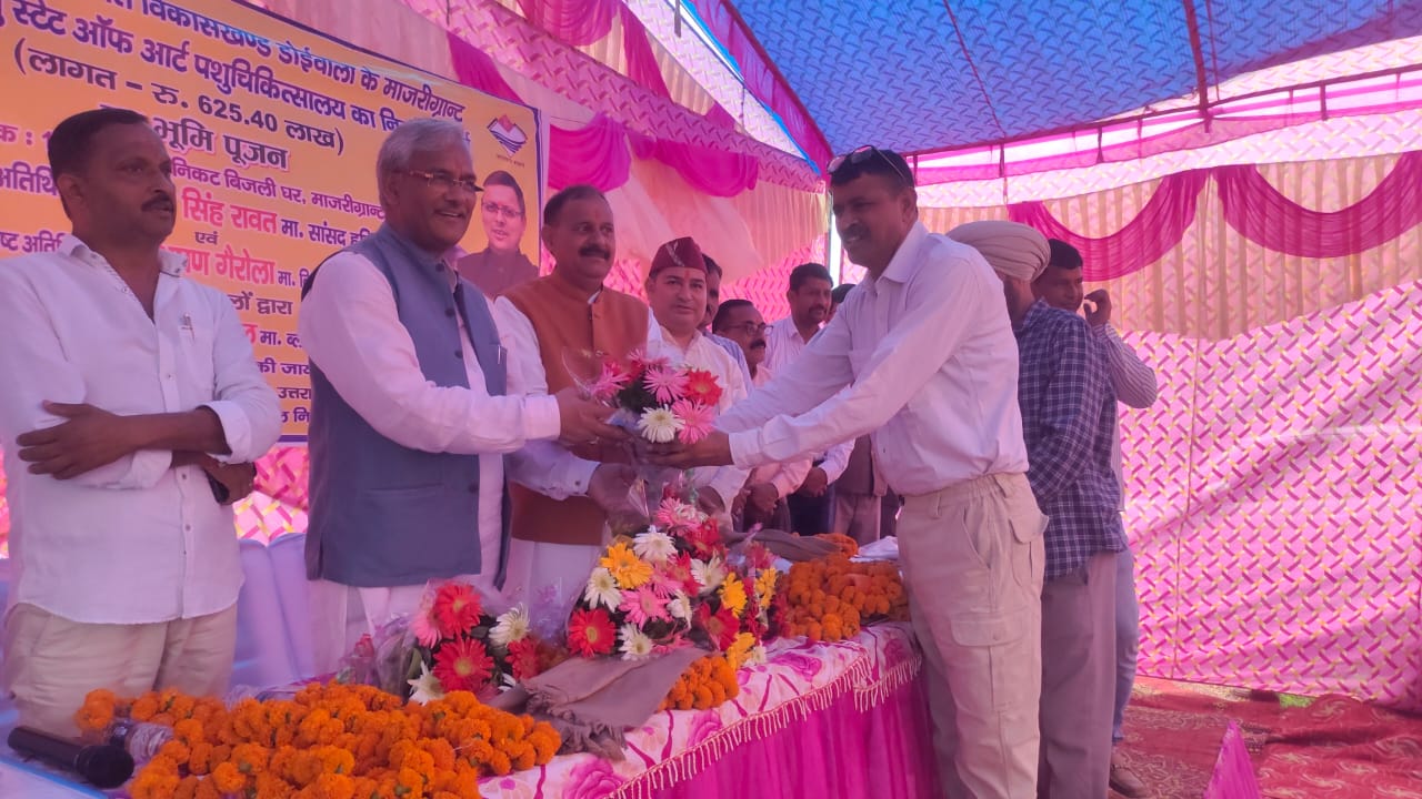देहरादून। हरिद्वार सांसद और पूर्व सीएम त्रिवेंद्र सिंह रावत ने रविवार को डोईवाला के माजरीग्रांट में ₹625.40 लाख की लागत से बड़े पशुओं हेतु बनने वाले राज्य के पहले स्टेट ऑफ आर्ट पशु चिकित्सालय का स्थानीय विधायक श्री बृजभूषण गैरोला की उपस्थिति में भूमि पूजन किया। पशु चिकित्सालय का लगभग दो बीघा में बनने वाला यह पशु चिकित्सालय सभी सुविधाओं से युक्त होगा । सांसद रावत ने कहा कि छोटे जानवरों जैसे बिल्ली कुत्ता आदि के लिए तो पहले ही देहरादून में चिकित्सालय मौजूद है। पर जिस तरह से बड़े जानवरों के लिए कोई चिकित्सालय मौजूद नहीं था तो वही बड़े पशुओं जैसे गाय,भैंस, घोड़ा आदि के लिए यह चिकित्सालय लाभदायक सिद्ध होगा और इस चिकित्सालय में अल्ट्रासाउंड एक्स-रे सर्जरी आदि सभी सुविधाएं उपलब्ध हो पाएंगी । वही इस चिकित्सालय के डोईवाला क्षेत्र में बनने से जहाँ किसानो को तो लाभ होगा ही वही पशुपालन करने वाले लोगों को इसका लाभ मिलेगा। उन्होंने कहा कि पशु चिकित्सालय के शिलान्यास से अवश्य ही भविष्य में राज्य के पशुधन को अत्यंत लाभ मिलेगा।