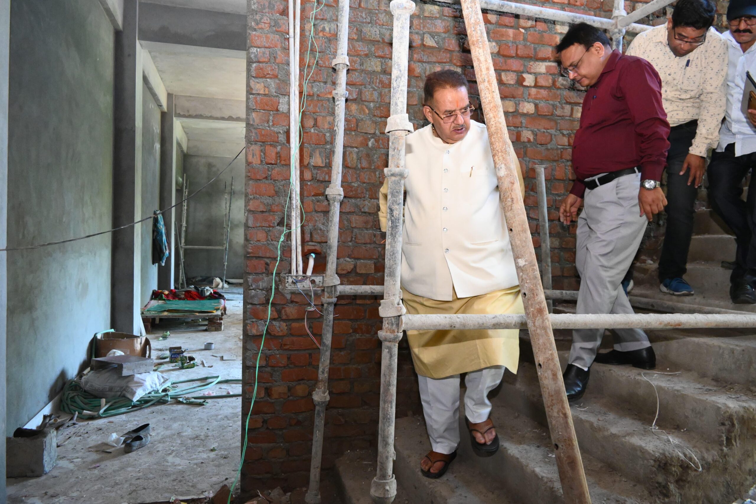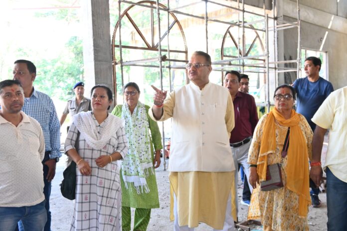 गढ़ीकैंट में निर्माणाधीन सामुदायिक भवन का निरीक्षण करते कैबिनेट मंत्री गणेश जोशी।
