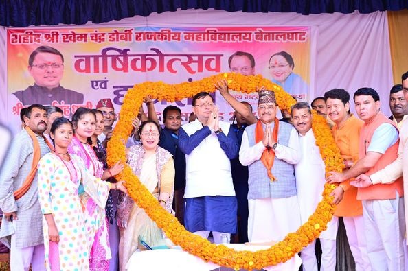 बेतालघाट, नैनीताल: शहीद खेमचंद्र डोरबी राजकीय स्नातकोत्तर महाविद्यालय में वार्षिकोत्सव के अवसर पर छात्रों को संबोधित करते हुए मुख्यमंत्री पुष्कर सिंह धामी ने कहा कि प्रदेश की शिक्षा व्यवस्था के समग्र विकास के लिए सरकार पूरी तत्परता से कार्य कर रही है। उन्होंने अमर शहीद खेमचंद्र के माता-पिता को सम्मानित कर उनके बलिदान को याद किया।