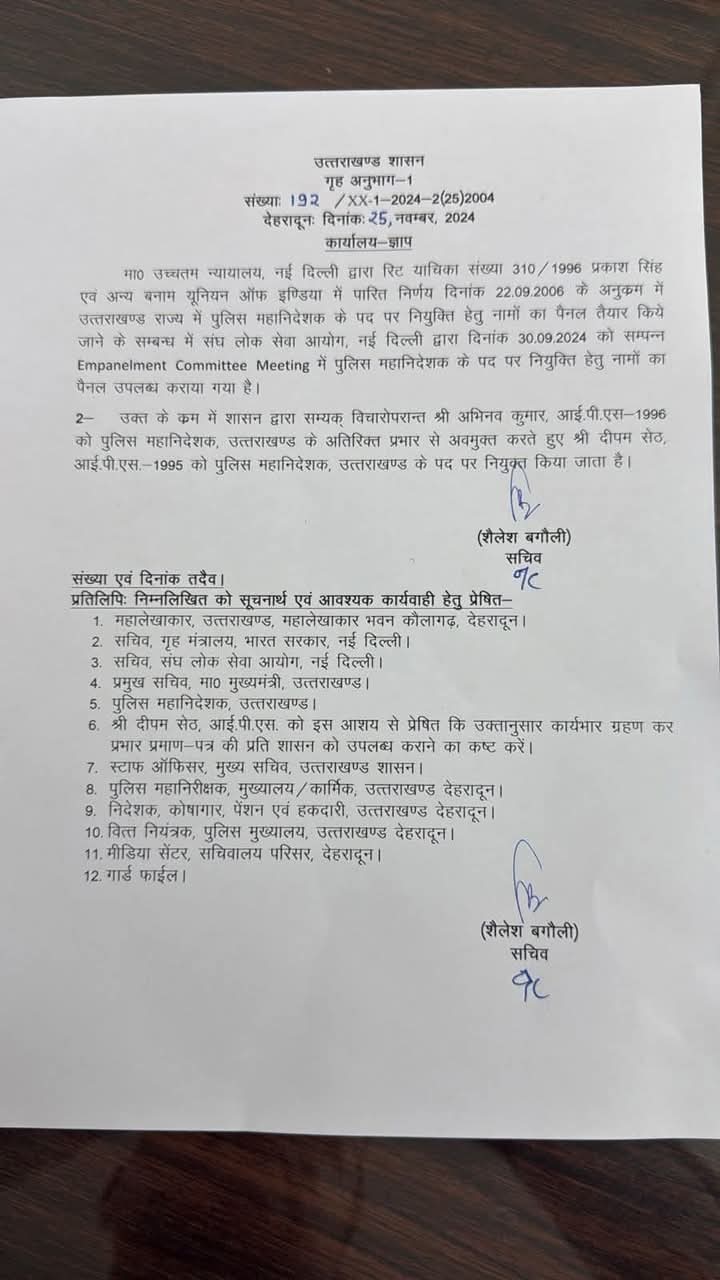 उत्तराखंड पुलिस के नए पुलिस महानिदेशक दीपम सेठ ने संभाला कार्यभार