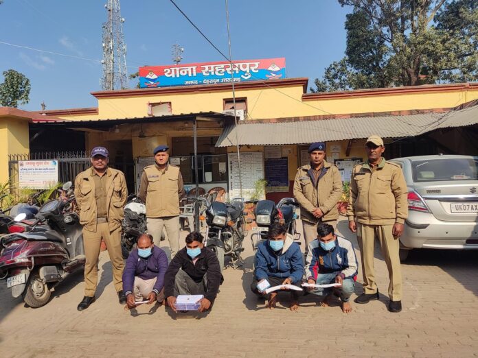 आधिकारिक सूत्रों के अनुसार, देहरादून पुलिस ने एसएसपी देहरादून की दिशा-निर्देशों में सहसपुर थाना क्षेत्र में गुप्त जानकारी के आधार पर ठगों की एक टोली का पर्दाफाश किया। पुलिस ने इस गिरोह के चार सदस्यों को गिरफ्तार किया, जिनके पास से भारी मात्रा में अवैध हथियार और 27 एटीएम कार्ड बरामद हुए हैं। अभियुक्तों के खिलाफ थाना सहसपुर में मामला दर्ज किया गया है।