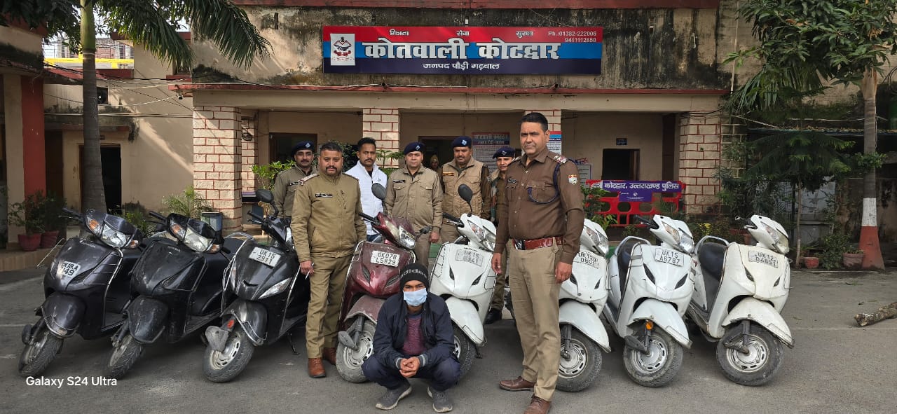 जिसके क्रम में अपर पुलिस अधीक्षक कोटद्वार चन्द्रमोहन सिंह के पर्यवेक्षण में प्रभारी निरीक्षक रमेश तनवार के नेतृत्व में कोटद्वार पुलिस टीम द्वारा इस पर त्वरित कार्यवाही करते हुए थाना क्षेत्र में सभी सम्भावित स्थानों पर लगे सीसीटीवी कैमरों को चैक करते हुये व पतारसी-सुरागरसी करते हुए उक्त अभियोग में संलिप्त अभियुक्त मनीष चन्द बुढ़ाकोटी,निवासी- पापरी शेरा,रिखणीखाल को आज दिनांक 09.01.2025 को चोरी की कुल 08 स्कूटियों (07 कोटद्वार व 01 डोईवाला से चोरी) के साथ गिरफ्तार किया गया। चोरी की गयी इन सभी 08 स्कूटियों को अभियुक्त के द्वारा रेलवे कॉलोनी कोटद्वार खंडहर के पास छुपाया गया था। अभियुक्त के विषय में जानकारी कर पाया गया कि यह स्कूटी चुराने में माहिर है और एक शातिर किस्म का वाहन चोर है और यह इससे पहले भी वाहन चोरी के मामलों में कई बार जेल भी जा चुका है। अभियुक्त को माननीय न्यायालय के समक्ष पेश कर आवश्यक वैधानिक कार्यवाही की जा रही है।