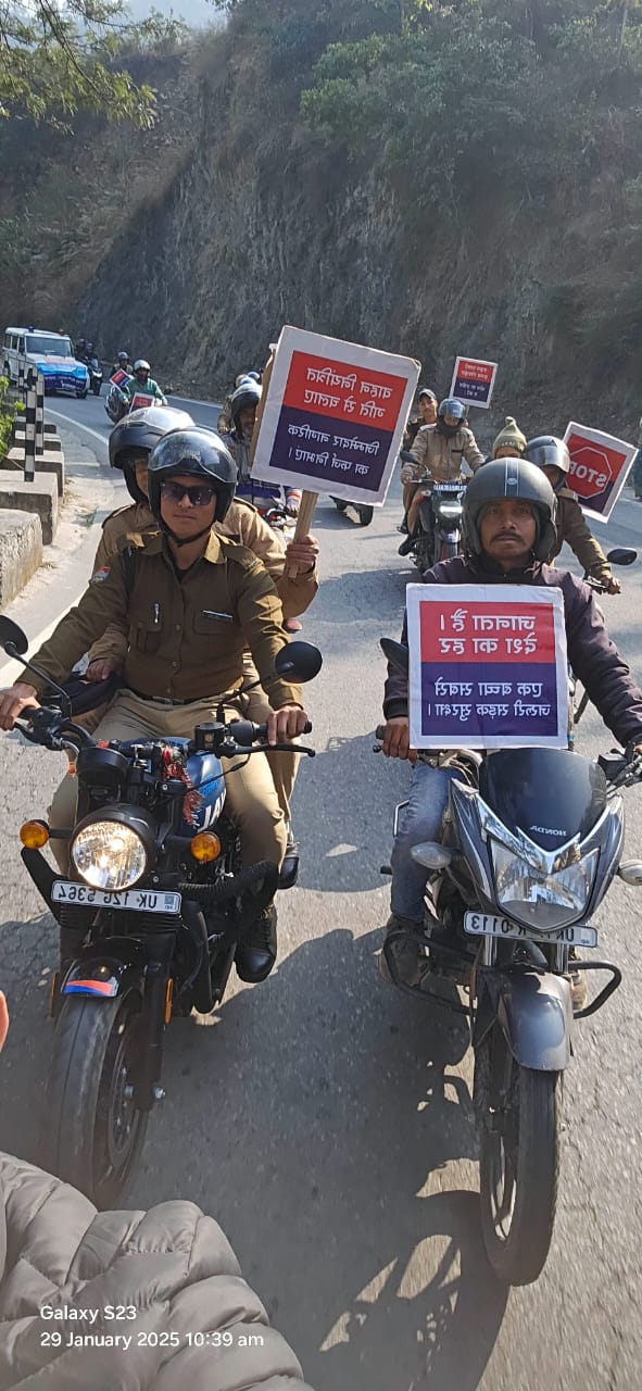 रैली के दौरान पुलिस टीम ने सड़क सुरक्षा माह के तहत सीट बेल्ट लगाने, आईएसआई मार्का हेलमेट पहनने और यातायात नियमों का पालन करने के प्रति जागरूक किया। इसके अलावा, ट्रिपल राइडिंग, नशे में वाहन चलाने, ओवरलोडिंग, क्षमता से अधिक सवारी बैठाने और रैश ड्राइविंग जैसे नियमों के उल्लंघन से होने वाले खतरों की जानकारी दी गई।