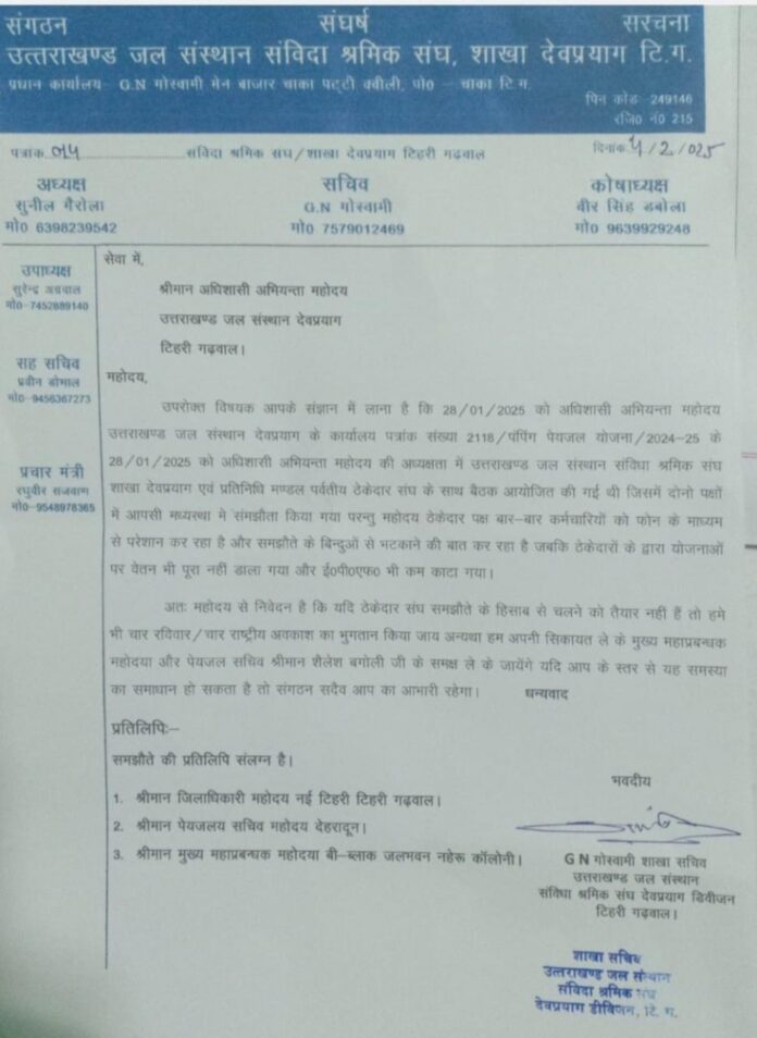 प्राप्त जानकारी के अनुसार, उत्तराखंड जल संस्थान संविदा श्रमिक संघ, शाखा देवप्रयाग और पर्वतीय ठेकेदार संघ के बीच 28 जनवरी 2025 को एक बैठक हुई थी। इस बैठक में दोनों पक्षों के बीच वेतन संबंधी मुद्दों को हल करने के लिए एक समझौता किया गया था। हालाँकि, रिपोर्ट्स के अनुसार, ठेकेदार पक्ष बार-बार श्रमिकों को फोन कर परेशान कर रहा है और समझौते के बिंदुओं से भटकाने का प्रयास कर रहा है।