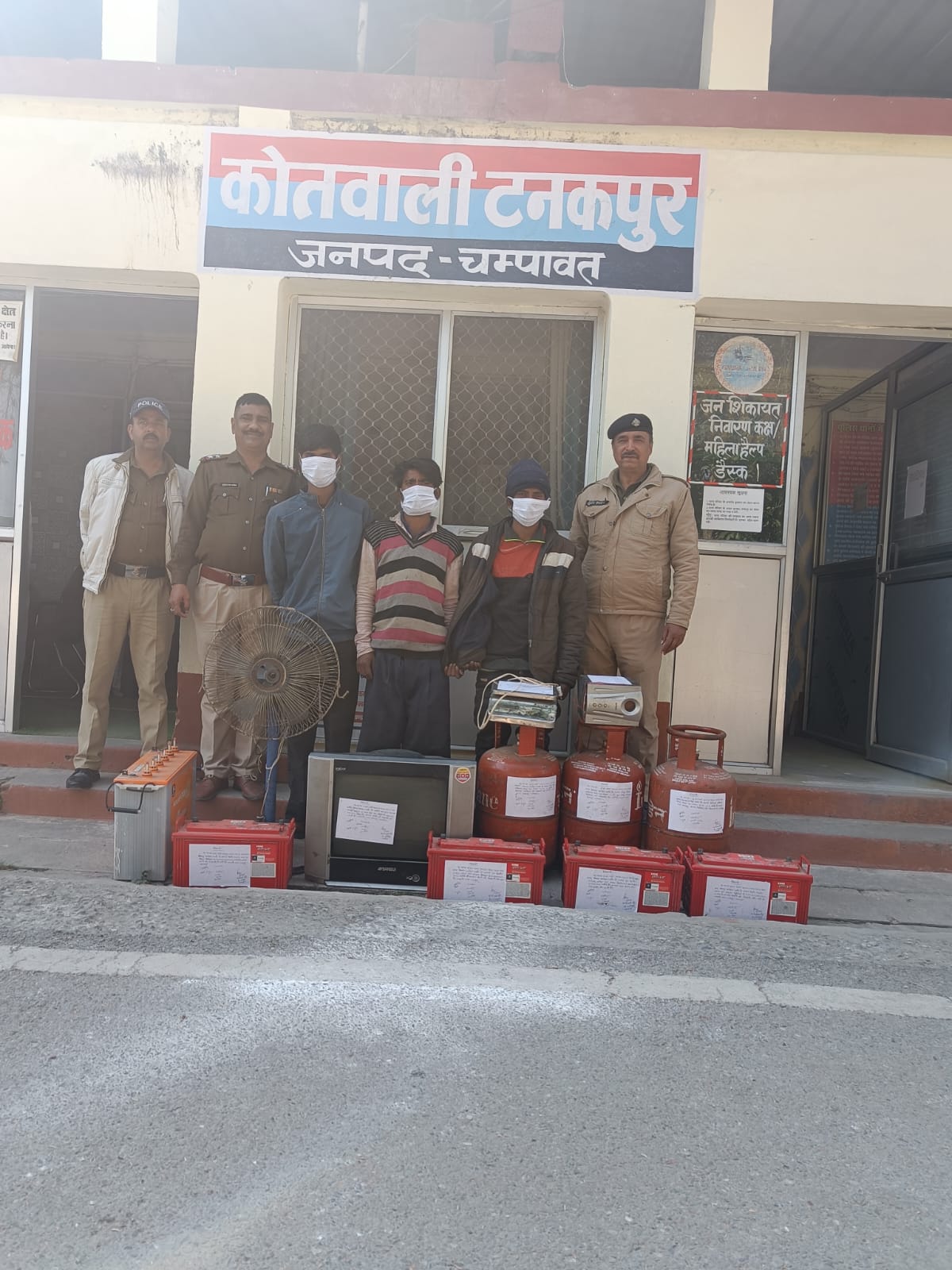 पुलिस टीम ने अभियुक्तों के बताए स्थान पर छापेमारी कर 4 गैस सिलेंडर, 1 सैंसुई टीवी, 4 बैटरियां, 1 इनवर्टर बैटरी, 1 होम थिएटर, 1 इलेक्ट्रॉनिक तराजू और 1 फर्राटा पंखा बरामद कर लिया। पुलिस ने अभियुक्तों को गिरफ्तार कर लिया है। गिरफ्तार किए गए अभियुक्तों की पहचान इस प्रकार है: