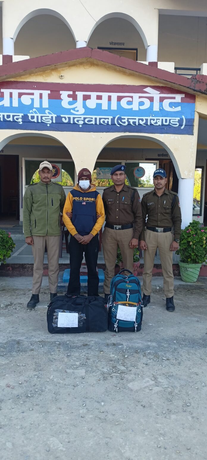 मिल रही जानकारी के अनुसार, पौड़ी पुलिस ने नशा तस्करों के खिलाफ जारी अभियान के तहत एक बड़ी सफलता हासिल की है। धुमाकोट पुलिस टीम ने शंकरपुर चेकपोस्ट पर चेकिंग के दौरान एक संदिग्ध व्यक्ति को रोका, जो पुलिस को देख नदी की तरफ जाने की कोशिश कर रहा था। शक होने पर जब पुलिस ने उसकी तलाशी ली तो दो बैग में छुपाकर रखा गया 18 किलो 900 ग्राम अवैध गांजा बरामद किया गया।