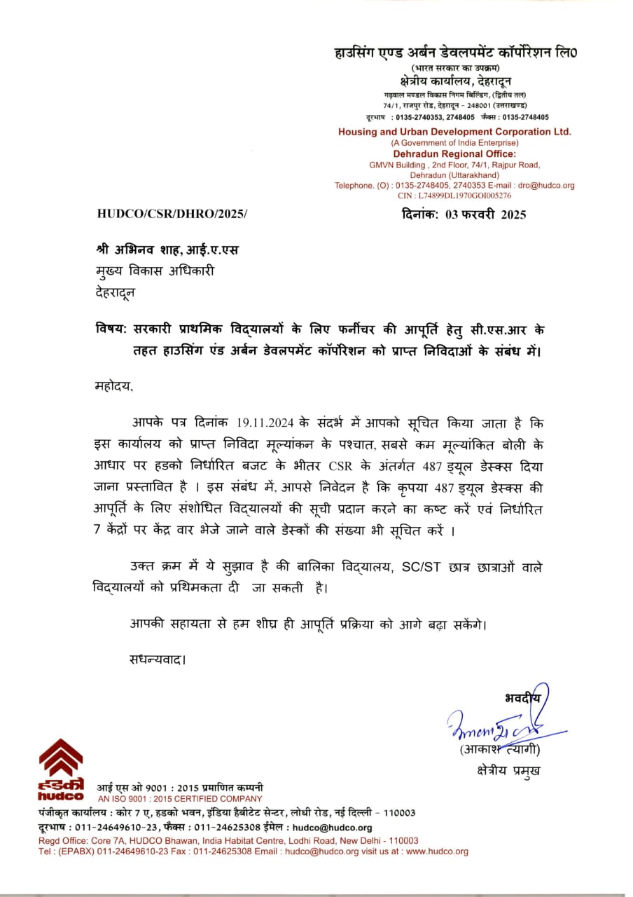 प्राप्त जानकारी के अनुसार, देहरादून जिले के सरकारी स्कूलों में पढ़ाई के स्तर को सुधारने और बच्चों को बेहतर शैक्षिक वातावरण देने के लिए जिलाधिकारी सविन बंसल द्वारा ‘उत्कर्ष’ प्रोजेक्ट शुरू किया गया है। इस प्रोजेक्ट के तहत जिले के 250 स्कूलों को 25 फरवरी तक फर्नीचर उपलब्ध कराया जाएगा। इस पहल में ओएनजीसी और हुडको जैसे प्रतिष्ठित संस्थानों का सहयोग मिल रहा है।