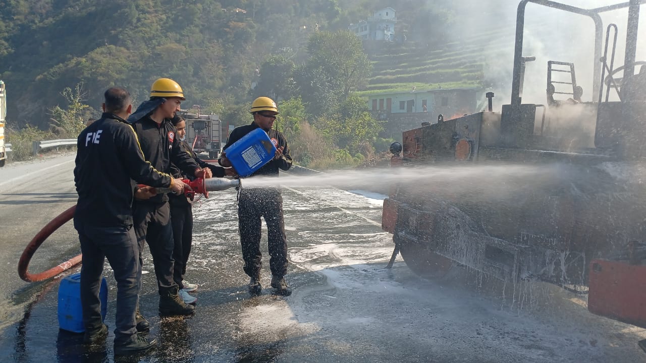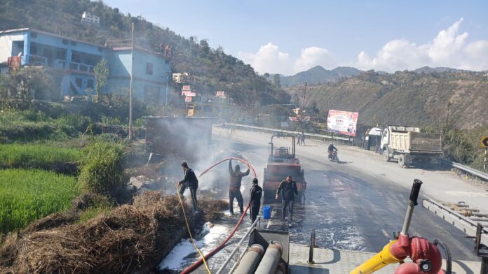 उत्तराखंड: रुद्रप्रयाग ,बद्रीनाथ हाईवे पर वाइब्रेटर रोलर में लगी भीषण आग, यातायात बाधित