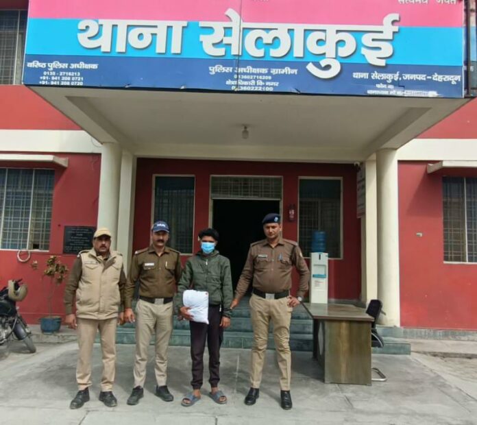 प्राप्त जानकारी के अनुसार, थाना सेलाकुई पुलिस टीम ने दिनांक 24 फरवरी 2025 को चेकिंग अभियान के दौरान मुखबिर की सूचना पर सारना नदी के किनारे स्थित राजा के ढाबे के पास से एक युवक को गिरफ्तार किया। तलाशी लेने पर उसके पास से 02 किलो 64 ग्राम अवैध गांजा बरामद हुआ। पुलिस ने आरोपी को मौके पर ही गिरफ्तार कर लिया और उसके खिलाफ एनडीपीएस एक्ट की धारा 8/20 के तहत मामला दर्ज किया गया।
