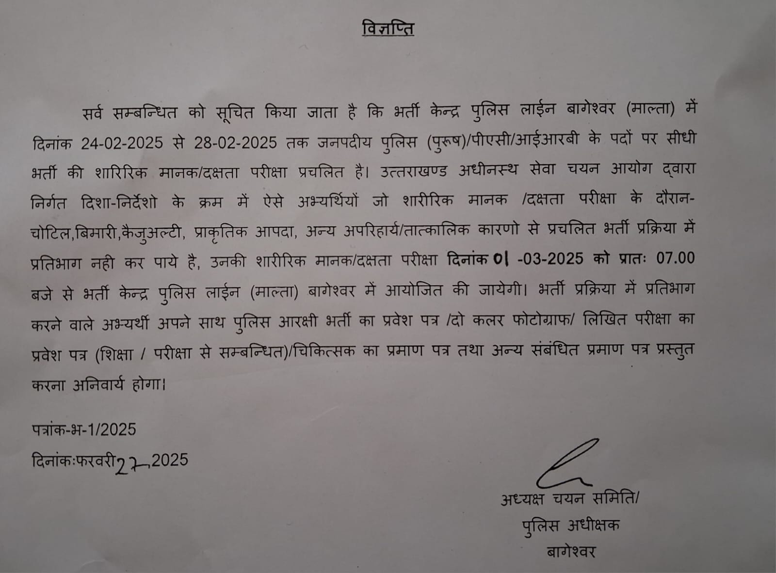 उत्तराखंड पुलिस भर्ती बोर्ड ने जानकारी दी है कि 24 से 28 फरवरी 2025 तक बागेश्वर (माल्ता) पुलिस लाइन भर्ती केंद्र में आयोजित जनपदीय पुलिस (पुरुष) पीएसी/आईआरबी के पदों की शारीरिक मानक दक्षता परीक्षा में जो अभ्यर्थी चोट, बीमारी, प्राकृतिक आपदा या किसी अन्य अपरिहार्य कारण से शामिल नहीं हो पाए थे, उनके लिए पुनः परीक्षा आयोजित की जाएगी।