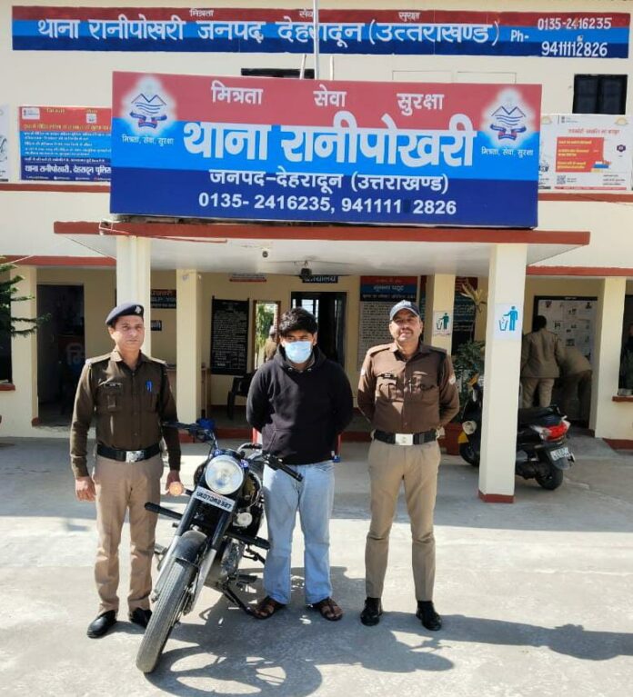 घटना के बाद पुलिस ने आरोपी की पहचान के लिए सीसीटीवी फुटेज की जांच की और वाहन के रजिस्ट्रेशन नंबर के आधार पर उसकी जानकारी जुटाई। जांच में सामने आया कि आरोपी का नाम उज्जवल नेगी (उम्र 19 वर्ष) है, जो रैनापुर, थाना रानीपोखरी का रहने वाला है। इसके बाद पुलिस ने उसे गिरफ्तार कर लिया और घटना में प्रयुक्त बुलेट मोटरसाइकिल (UK-07-DA-2327) को सीज कर लिया।
