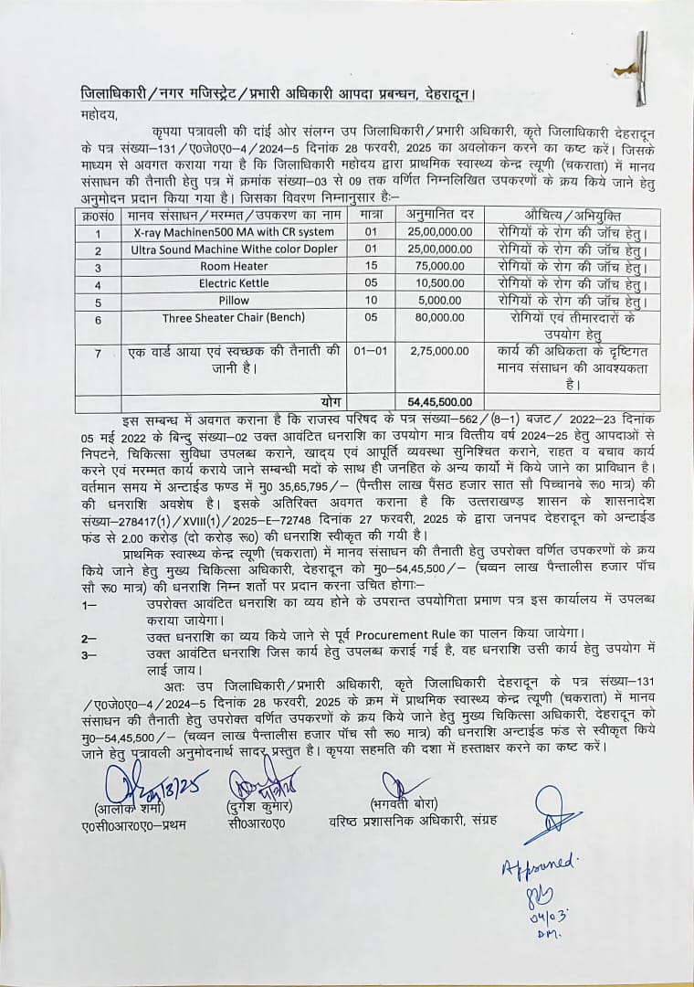 रिपोर्ट के अनुसार, सामुदायिक स्वास्थ्य केंद्र त्यूनी को बेहतर चिकित्सा सुविधाओं के लिए 54.45 लाख रुपये जारी किए गए हैं। इस राशि का उपयोग नई एक्स-रे मशीन, अल्ट्रासाउंड मशीन, रूम हीटर, इलेक्ट्रिक केतली, तकिए, थ्री-सीटर कुर्सियां और अन्य आवश्यक उपकरणों की खरीद के लिए किया जाएगा। इसके अतिरिक्त, अस्पताल में आउटसोर्सिंग के माध्यम से एक वार्ड आया और स्वच्छता कर्मी की नियुक्ति की जाएगी, जिससे मरीजों को अधिक सुविधा मिलेगी।