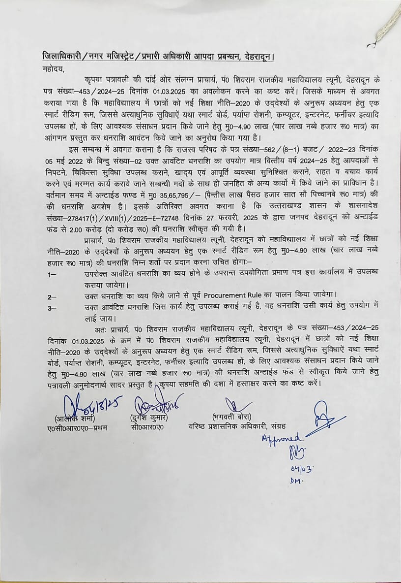 पंडित शिवराम राजकीय महाविद्यालय त्यूनी को लाइब्रेरी, रीडिंग रूम, कंप्यूटर, इंटरनेट और फर्नीचर जैसी सुविधाओं के लिए 4.90 लाख रुपये की धनराशि दी गई है। यह छात्रों को बेहतर अध्ययन माहौल देने में मदद करेगा।