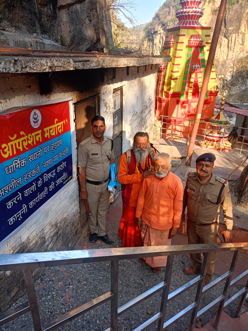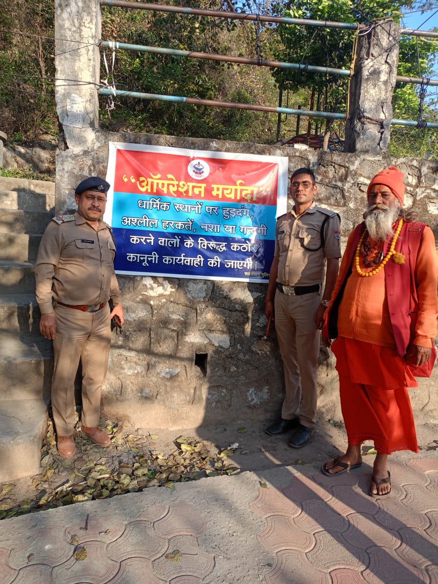 पुलिस अधीक्षक रुद्रप्रयाग द्वारा दिए गए निर्देशों के क्रम में प्रभारी निरीक्षक मनोज नेगी के नेतृत्व में कोतवाली रुद्रप्रयाग पुलिस द्वारा धार्मिक स्थलों, स्नान घाटों आदि स्थानों पर अमर्यादित, अशोभनीय कृत्य करने, नशा करके हुड़दंग करने, गंदगी करने आदि जैसी बढ़ती शिकायतों पर रोक लगाने के उद्देश्य से कोतवाली रुद्रप्रयाग क्षेत्रान्तर्गत कोटेश्वर महादेव मंदिर, श्री उमरानारायण मंदिर, रुद्रप्रयाग संगम आदि स्थानों पर ऑपरेशन मर्यादा से संबंधित बैनर पोस्टर लगाए लगाए गए तथा आमजनमानस को धार्मिक स्थलों तथा पर्यटन स्थलों पर साफ-सफाई बनाए रखने में अपना योगदान देनें के सम्बन्ध में जागरुक किया गया साथ ही लोगों से “आपरेशन मर्यादा” के तहत पुलिस का सहयोग करने की अपील की गयी।