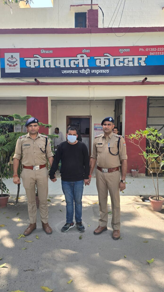 जिसके क्रम में अपर पुलिस अधीक्षक कोटद्वार चन्द्रमोहन सिंह, क्षेत्राधिकारी कोटद्वार निहारिका सेमवाल के पर्यवेक्षण में प्रभारी निरीक्षक कोटद्वार रमेश सिंह तनवार के नेतृत्व में पुलिस टीम का गठन किया गया। गठित पुलिस टीम द्वारा अथक प्रयासों के फलस्वरूप इस मुकदमें में संलिप्त अभियुक्त की गिरफ्तारी करने हेतु पुलिस टीम द्वारा लगातार प्रयास किया जा रहा था। पुलिस टीम द्वारा उक्त अभियुक्त गिरीश चन्द्र मिश्रा को आज दिनांक 26.03.2025 लाल बत्ती चौक कोटद्वार के पास से गिरफ्तार किया गया जिसके कब्जे से उसका उत्तराखंड सचिवालय का फर्जी आईडी कार्ड भी बरामद किया गया। जिसके आधार पर मुकदमा उपरोक्त में धारा-238,338,363(3),340(2) बीएनएस की वृद्धि की गई। अभियुक्त शातिर किस्म का अपराधी है जो अपने आप को उत्तराखंड सचिवालय का समीक्षा अधिकारी बताकर सरकारी नौकरी दिलाने के नाम पर कई भोले-भाले लोगों से पैसा ठग चुका है इसके विरुद्ध जनपद अल्मोड़ा व नैनीताल में आपराधिक मामले दर्ज है। उक्त गिरफ्तारशुदा अभियुक्त को आज माननीय न्यायालय के समक्ष पेश आवश्यक वैधानिक कार्यवाही की जा रही है।