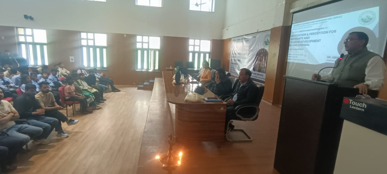 हेमवंती नन्दन बहुगुणा विश्वविद्यालय, श्रीनगर में University Placement And Counseling Cell के सम्बन्ध में एक दिवसीय सेमिनार आयोजित किया गया। सेमीनार में बतौर मुख्य अतिथि डॉ. अभिषेक त्रिपाठी मुख्य विकास अधिकारी, टिहरी गढ़वाल के द्वाराSkill Development Program On Motivation & Perception For Aspirants And Tourism Development In Tehri Garhwal के बारे में जानकारी दी गयी। उन्होंने छात्रों को पर्यटन एवं सरकारी विभागों द्वारा स्वरोजगार हेतु संचालित किए जा रहे ध्वज वाहक कार्यक्रमों के तहत विभिन्न क्षेत्रों में स्वरोजगार हेतु अपना व्यवसाय करने के लिए प्रेरित किया।