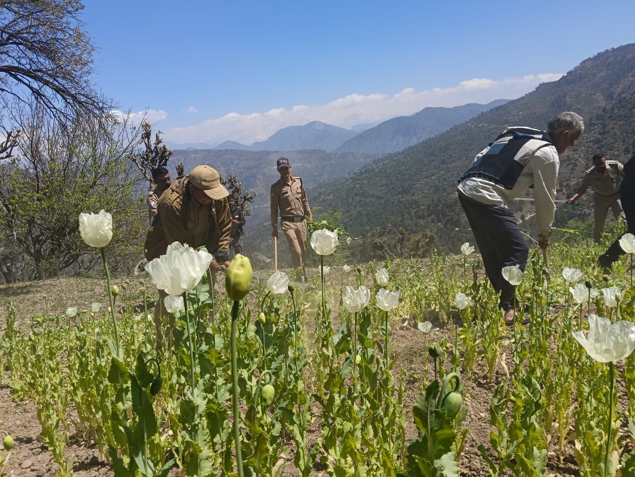 ड्रग्स फ्री देवभूमि मिशन के अन्तर्गत पुलिस अधीक्षक उत्तरकाशी के निर्देशन उत्तरकाशी पुलिस द्वारा चलाये जा रहे नशामुक्त के तहत जनपद पुलिस द्वारा एक ओर नशे के सौदागरों की लगातार धर-पक्कड की जा रही है, वहीं दूसरी तरफ नशे के अवैध कारोबार/नशीले पदार्थो की अवैध खेती के सम्बन्ध मे जानकारी जुटाते हुये नष्ट कर नशे का जड से खात्मा करने के प्रयास किये जा रहे हैं । इस क्रम मे थाना धरासू पुलिस द्वारा नशीले पदार्थों की अवैध खेती के सम्बन्ध मे एक सटीक जानकारी जुटाकर आज 31.03.2025 को प्रभारी निरीक्षक धरासू, दिनेश कुमार के नेतृत्व मे राजस्व विभाग की टीम को साथ लेकर थाना धरासू के बनचौरा क्षेत्रान्तर्गत जेष्टवाडी गांव के मलाडी व देवीदार तोक मे छापेमारी कर करीब 0.3 हेक्टेयर (15 नाली) भू-भाग पर पैदा की गयी प्रतिबन्धित अफीम / पोस्त की खेती का विनिष्टीकरण किया गया।