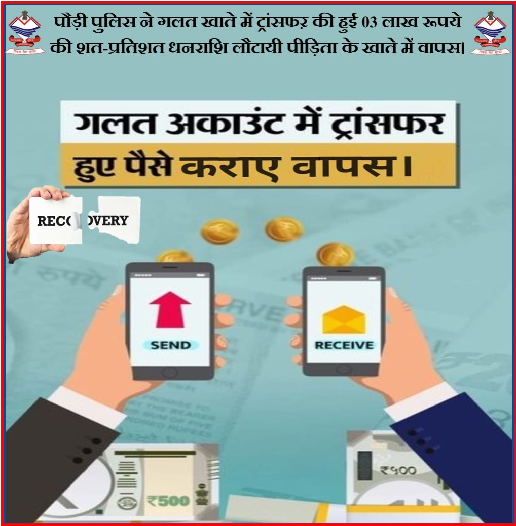 पौड़ी पुलिस ने गलत खाते में ट्रांसफऱ की हुई 03 लाख रूपये की शत-प्रतिशत धनराशि लौटायी पीड़िता के खाते में वापस।
