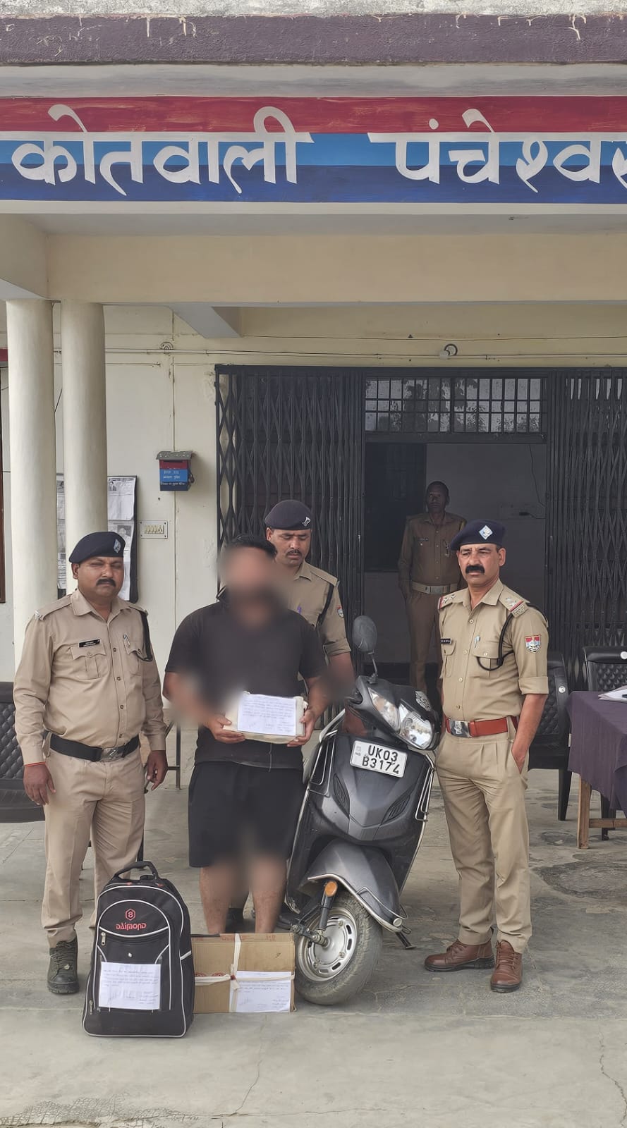जनपद चंपावत में नशे के बढ़ते प्रभाव को लेकर पुलिस अधीक्षक अजय गणपति के सख्त निर्देश हैं कि मादक पदार्थों की तस्करी में लिप्त लोगों के खिलाफ कड़ी कार्रवाई की जाए। इसी क्रम में, पंचेश्वर थाना क्षेत्र में पुलिस टीम लगातार सक्रिय है। आज, 27 अप्रैल 2025 को थाना कोतवाली पंचेश्वर पुलिस टीम क्षेत्र में गश्त कर रही थी। इसी दौरान, उन्हें एक स्कूटी (UK-03-B-3174) पर सवार एक व्यक्ति संदिग्ध परिस्थितियों में घूमता हुआ दिखाई दिया।