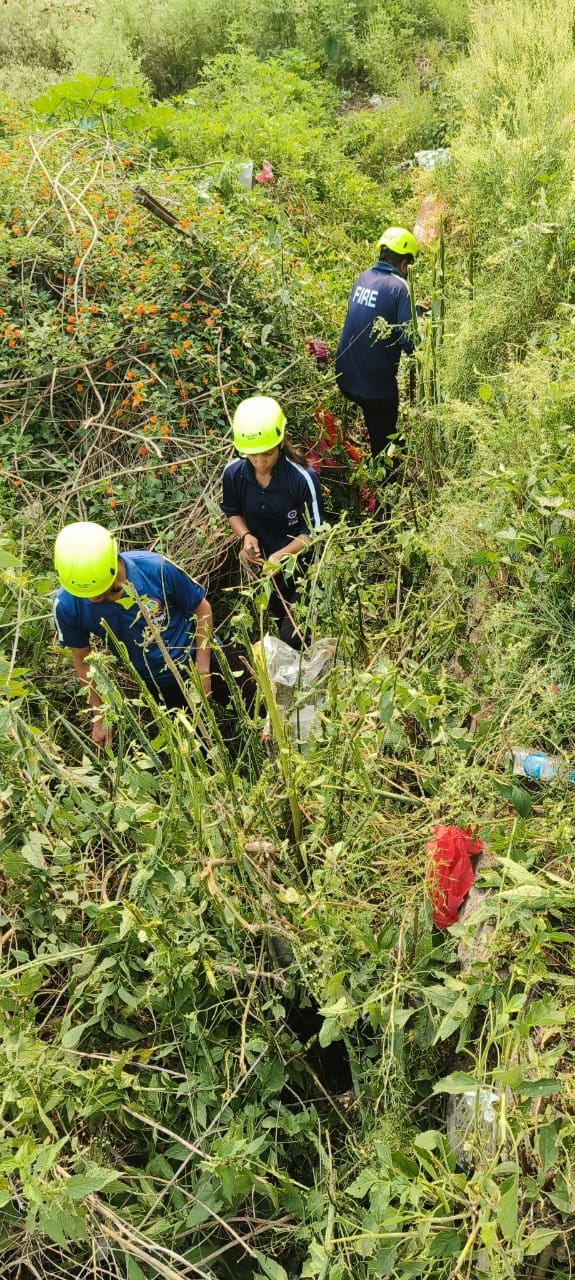 दूरभाष पर सूचना प्राप्त हुई कि HDFC Bank के सामने रोड़ से नीचे नाले में गाय गिर गई है जो झाड़ियों में फंस गई है।