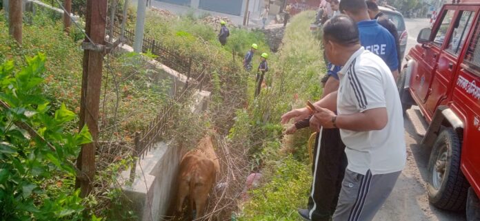 सड़क किनारे नाले में गिरी गाय को फायर रेस्क्यू टीम ने सुरक्षित बाहर निकाला।