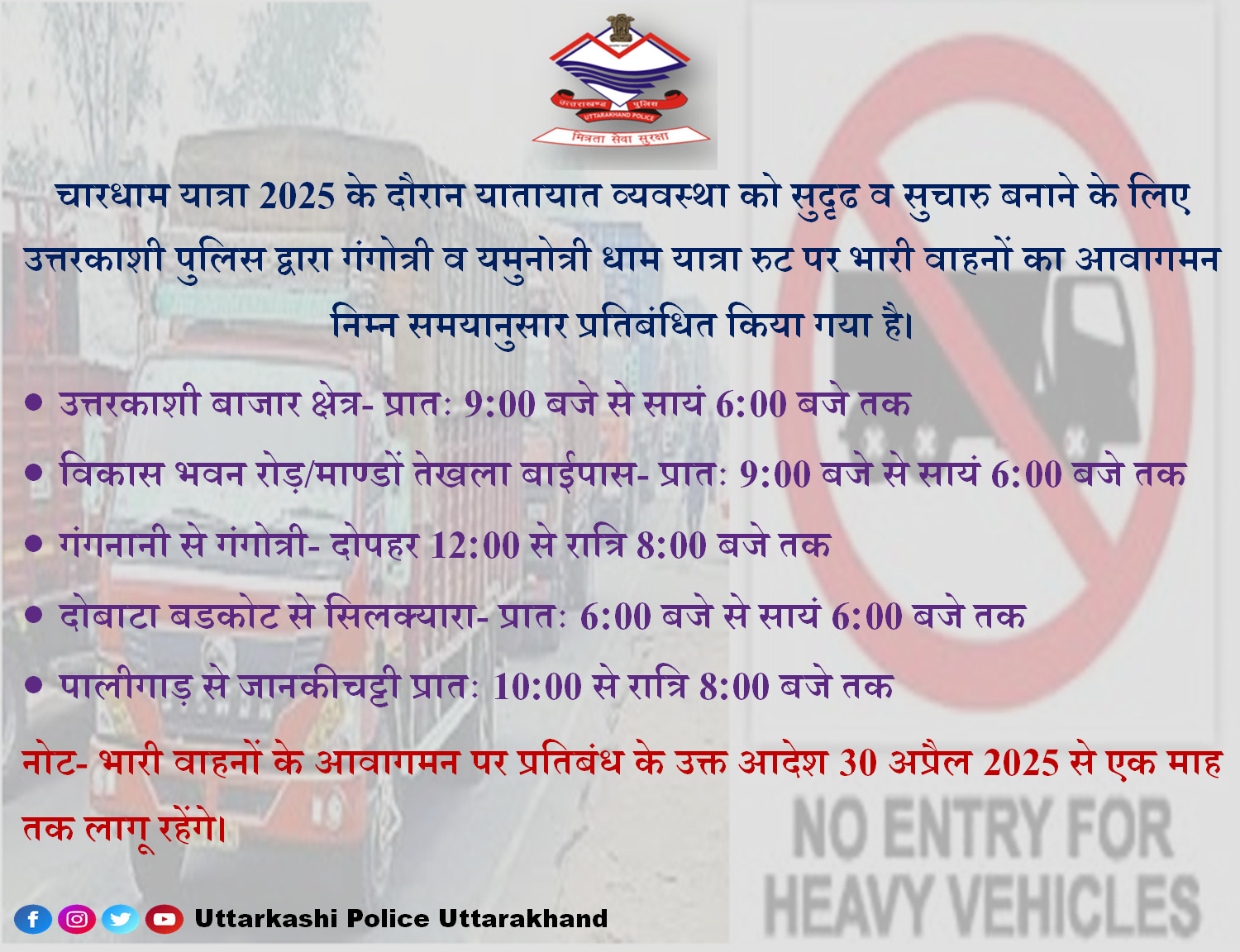 इसके अतिरिक्त, चारधाम यात्रा 2025 के दौरान यातायात व्यवस्था को सुदृढ़ और सुचारु बनाए रखने के लिए पुलिस अधीक्षक उत्तरकाशी के निर्देशानुसार, गंगोत्री और यमुनोत्री धाम यात्रा मार्गों पर भारी वाहनों के आवागमन पर भी प्रतिबंध लगाया गया है। यह प्रतिबंध 30 अप्रैल 2025 से प्रभावी होगा और अगले एक महीने तक लागू रहेगा। प्रतिबंध का समय इस प्रकार है: