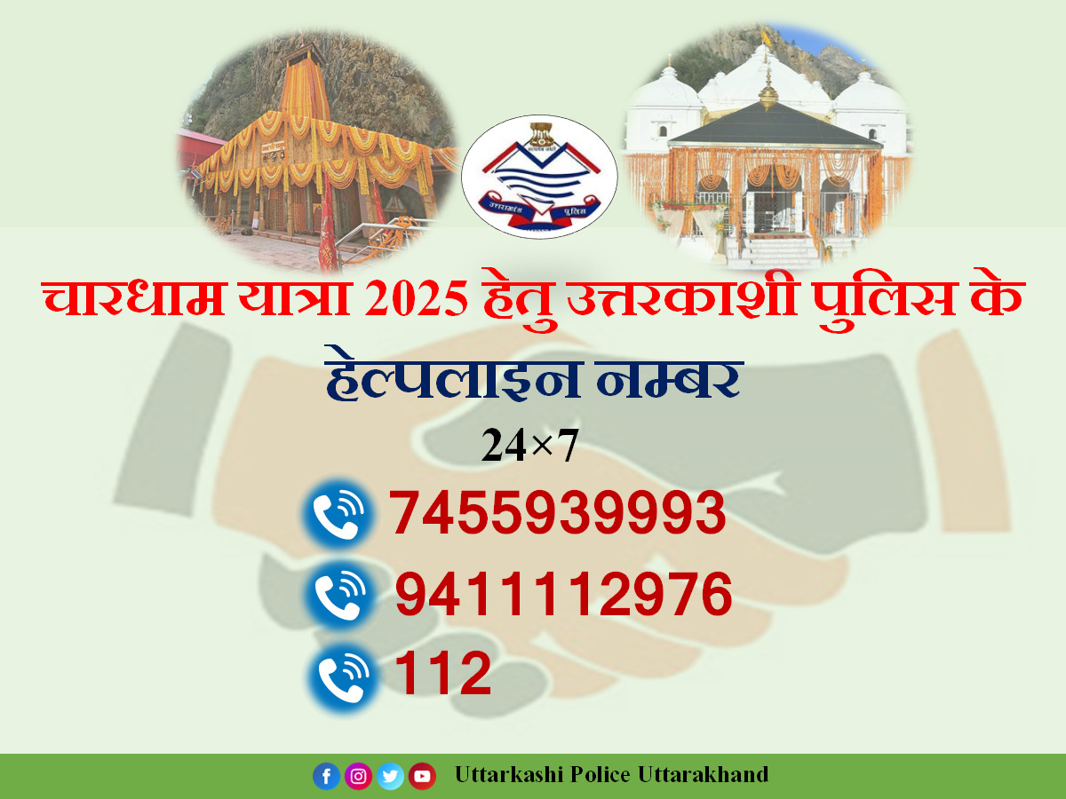 प्राप्त सूचना के अनुसार, पुलिस अधीक्षक उत्तरकाशी सरिता डोबाल के निर्देशन में, उत्तरकाशी पुलिस ने चारधाम यात्रा पर जनपद में आने वाले श्रद्धालुओं की सहायता के लिए विशेष हेल्पलाइन नंबर जारी किए हैं। ये हेल्पलाइन नंबर 7455939993, 9411112976 और 112 हैं। श्रद्धालु किसी भी पुलिस संबंधी सहायता के लिए इन नंबरों पर 24 घंटे कॉल कर सकते हैं और पुलिस से मदद प्राप्त कर सकते हैं। उत्तरकाशी पुलिस ने श्री यमुनोत्री और गंगोत्री धाम की यात्रा पर आने वाले सभी श्रद्धालुओं का हार्दिक स्वागत और अभिनंदन किया है और उनकी सुखद यात्रा के लिए हर संभव सहायता प्रदान करने के लिए तत्पर है।