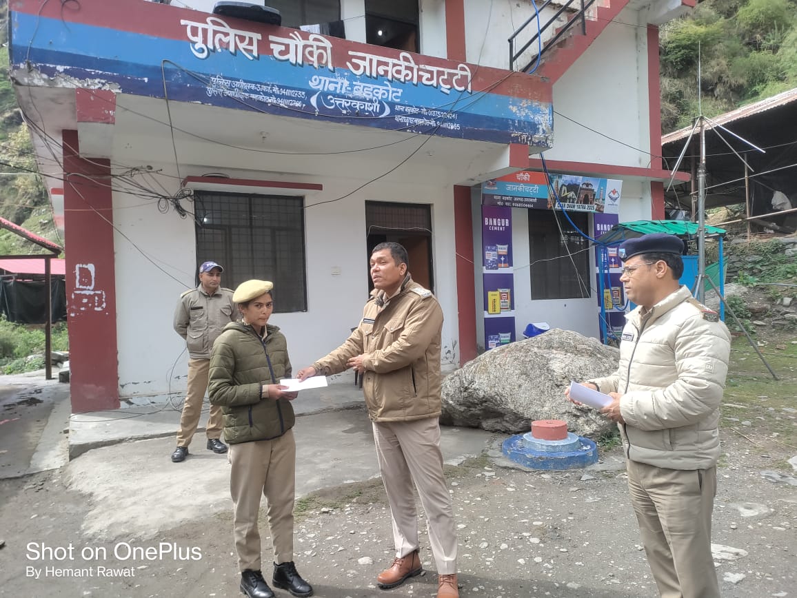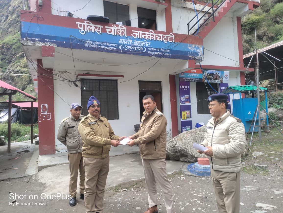 चारधाम यात्रा-2025 के सरल, सुगम व सुरक्षित संचालन हेतु पुलिस अधीक्षक उत्तरकाशी महोदया के निर्देशन मे उत्तरकाशी पुलिस लगातार तत्पर है। यात्रा के दौरान पुलिस के उच्चधिकारियों द्वारा स्वयं रोड पर उतरकर यातायात व यात्रा प्रबंधन को देखा जा रहा है, ड्यूटी मे नियुक्त पुलिस जवानों की हौसला अफजाई की जा रही है। पुलिस उपाधीक्षक बड़कोट, देवेन्द्र सिंह नेगी द्वारा आज 12.05.2025 को यमुनोत्री यात्रा रूट का बड़कोट से लेकर जानकीचट्टी तक निरीक्षण कर पुलिस ड्यूटियो को चैक किया गया। अगले कुछ दिनों यात्रा पीक व बारिश के अलर्ट को देखते हुये सभी पुलिस अधिकारी व कर्मियों को अधिक सर्कतता व सावधानी के साथ ड्यूटी करने के निर्देश दिये गये। संवेदनशील जोन डाबरकोट पर नियुक्त फोर्स को अलर्ट रहने तथा ज्यादा बारिश व स्लाइडिंग के समय आस-पास के चैक पोस्टों व उच्चधिकारियो को सूचित कर यात्रियों को सुरक्षित स्थान पर रुकवाने की हिदायत दी गयी। सभी को यात्रियों के साथ सभ्य व मृदु व्यवहार तथा संदिग्ध व्यक्ति व गतिविधियों पर पैनी नजर रखने की हिदायत दी गयी। उनके द्वारा पुलिस चौकी जानकीचट्टी पर नियुक्त निम्न कर्मियों को यात्रा सीजन के दौरान अच्छी ड्यूटी करने पर सम्मानित किया गया।