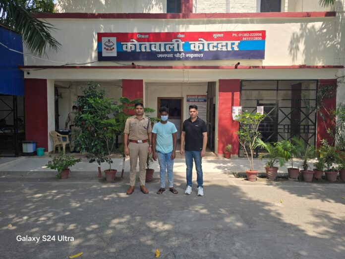 दिनांक 08.09.2024 को कोतवाली कोटद्वार पर वादी मयंक नेगी,कोटद्वार द्वारा एक शिकायती प्रार्थना पत्र दिया गया। जिसमें बताया गया कि 1.सतीश कुमार,निवासी-दिल्ली 2.राजकुमार बैनर्जी उर्फ सुब्रुतो,निवासी- कृष्णानगर दिल्ली, द्वारा वादी को ईस्टर्न रेलवे में “GROUP –C” की नौकरी लगाने के नाम पर धोखाधड़ी करके फर्जी नियुक्ति पत्र तथा इस्टर्न रेलवे का आई कार्ड देकर वादी से 30,70,550/- रूपये ठग लिए गये हैं। इस शिकायती प्रार्थना पत्र के आधार पर कोतवाली कोटद्वार में मु0अ0सं0-229/24,धारा-420भादवि पंजीकृत किया गया।