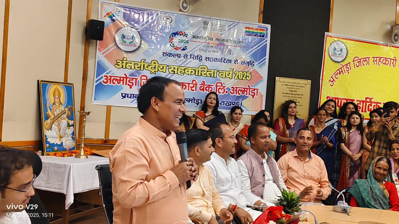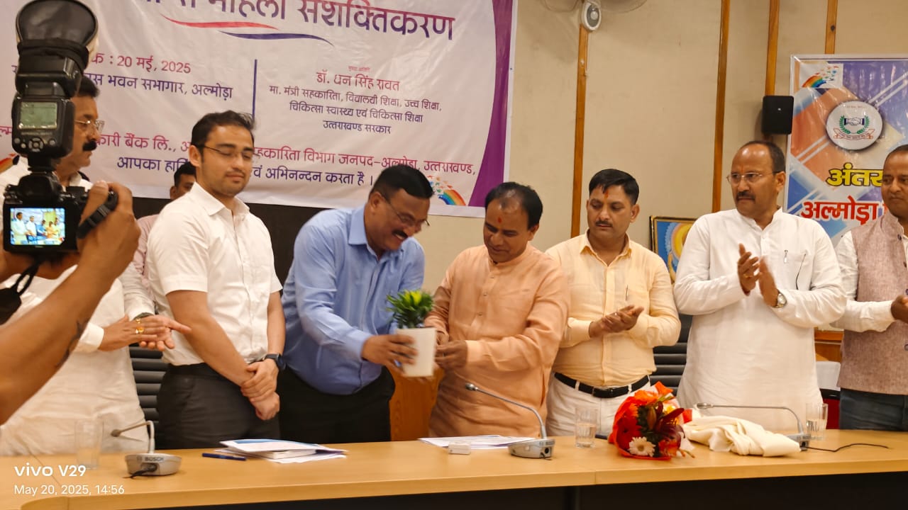 अंतरराष्ट्रीय सहकारिता वर्ष 2025 के उपलक्ष्य में आज विकासभवन सभागार में “सहकारिता से महिला सशक्तिकरण” विषय पर एक गोष्ठी का आयोजन किया गया। इस गोष्ठी का आयोजन अल्मोड़ा सहकारी बैंक तथा सहकारिता विभाग अल्मोड़ा द्वारा किया गया। गोष्ठी में सहकारिता मंत्री उत्तराखंड डॉ धन सिंह रावत ने बतौर मुख्य अतिथि प्रतिभाग किया। कार्यक्रम में बेहतर कार्य करने वाले स्वयं सहायता समूहों एवं महिलाओं को कैबिनेट मंत्री डॉ धन सिंह रावत द्वारा सम्मानित किया गया तथा महिलाओं एवं स्वयं सहायता समूहों को ब्याज रहित 0% पर 65.00 लाख के चेक भी वितरित किए । यह धनराशि महिलाओं को रोजगार प्रेरक कार्य करने हेतु प्रदान की गई है।