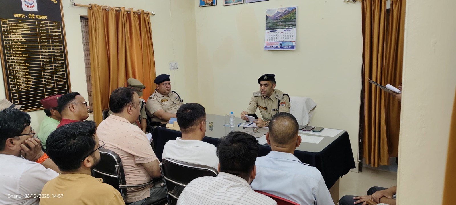 आज दिनांक 12.06.2025 को श्रीमान वरिष्ठ पुलिस अधीक्षक महोदय, पौड़ी श्री लोकेश्वर सिंह द्वारा कोतवाली श्रीनगर परिसर में व्यापार मण्डल सदस्यों, पार्षदों व सी.एल.जी मैम्बर्स आदि के साथ गोष्ठी का आयोजन किया गया जिसका उद्देश्य पुलिस की कार्यप्रणाली का फीडबैक लेना व सुझाव आंमत्रित कर उन पर क्रियान्वयन करना था। मीटिंग में सर्वप्रथम उपस्थित सभी सी.एल.जी मैम्बर्स का परिचय प्राप्त किया गया। तत्पश्चात गोष्ठी प्रारम्भ की गयी। जिसमें सभी सम्भ्रान्तों की समस्याओं एवं सुझावों के लेकर निम्न बिन्दुओं पर ध्यान आकर्षित किया गयाः-