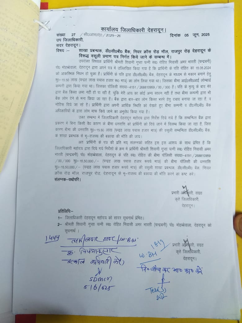 दरअसल जिलाधिकारी के जनता दर्शन कार्यक्रम में शिवानी गुप्ता पत्नी स्व0 रोहित निवासी अमर भारती, चन्द्रबनी अपनी फरियाद लेकर पहुंची थी। शिवानी गुप्ता ने बताया कि उनके पति द्वारा डीसीबी प्रा0 लि0 बैंक से 15.50 लाख का ऋण लिया था, जिसका बीमा आईसीआई लोंबार्ड कंपनी द्वारा किया गया था। उनके पति का 15 मई 2024 आकस्मिक निधन हो गया था। शिवानी गुप्ता ने बताया कि पति की मृत्यु के बाद उनकी आय का कोई साधन न होने के कारण बैंक किस्त जमा नही हो पा रही है। बीमा कम्पनी द्वारा बैंक लोन देने से मना किया जा रहा है। डीसीबी बैंक व बीमा कंपनी से इस संबंध में कई बार अनुरोध किया है, परंतु बीमा कंपनी द्वारा धनराशि दिए जाने में अनावश्यक विलंब किया जा रहा है और बैंक द्वारा बार-बार किश्त जमा करने का दबाव बनाया जा रहा है। जिस पर डीएम ने बैंक प्रबन्धक डीसीबी प्रा0लि0 को उपस्थित होने और महिला की समस्या का निस्तारण करने के निर्देश दिए थे। जिला प्रशासन द्वारा 09 जून को सम्बन्धित बैंक प्रबन्धक के विरुद्ध ब्याज सहित रू0 1705000 आरसी जारी करते हुए 16 जून तक आरसी जमा करने के निर्देश दिए गए थे। डीसीबी प्रबंधक को बार-बार नोटिस जारी करने के बाद भी उक्त प्रकरण पर कोई कार्रवाई नहीं की गई