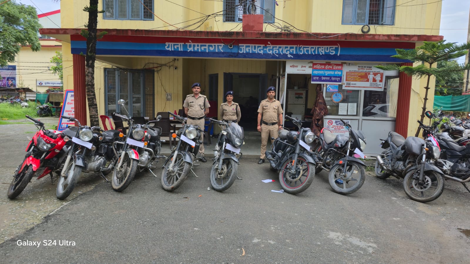 वरिष्ठ पुलिस अधीक्षक देहरादून द्वारा सभी थाना प्रभारियों को अपने-अपने थाना क्षेत्र में यातायात नियमों का उल्लंघन करने वालों के विरुद्ध प्रभावी कार्रवाई के निर्देश दिए गए हैं। उक्त निर्देशों के क्रम में प्रेमनगर पुलिस द्वारा थाना क्षेत्र अंतर्गत पौंधा, बिधौली, नौगांव पीपलचौक, नंदा की चौकी, झाझरा व प्रेमनगर क्षेत्र में सघन चेकिंग अभियान चलते हुए मॉडिफाईड साइलेंसर व पटाखे फोड़ने वाली मोटरसाइकिलों के विरुद्ध प्रभावी कार्रवाई की गई